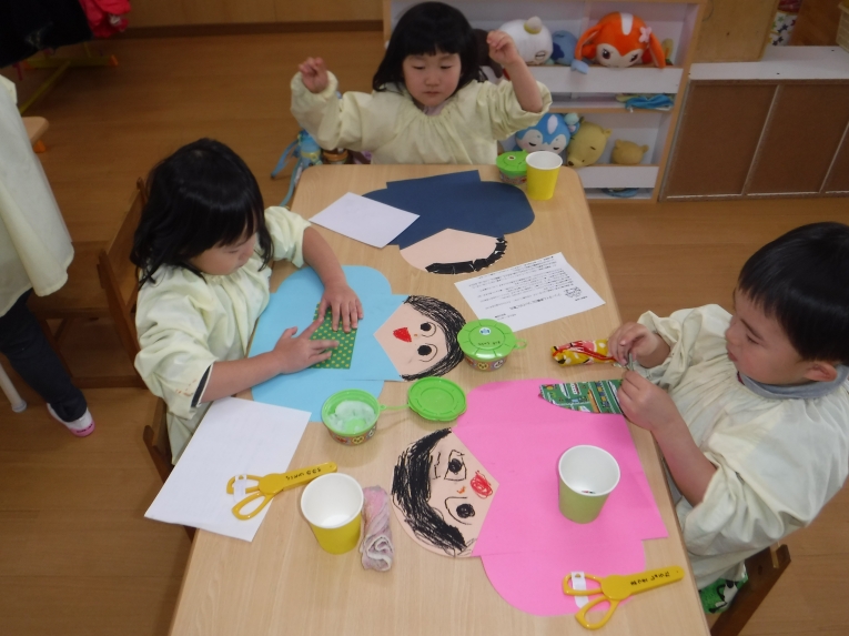 髪の毛もクレヨンと折り紙のちぎり貼りから選びました。