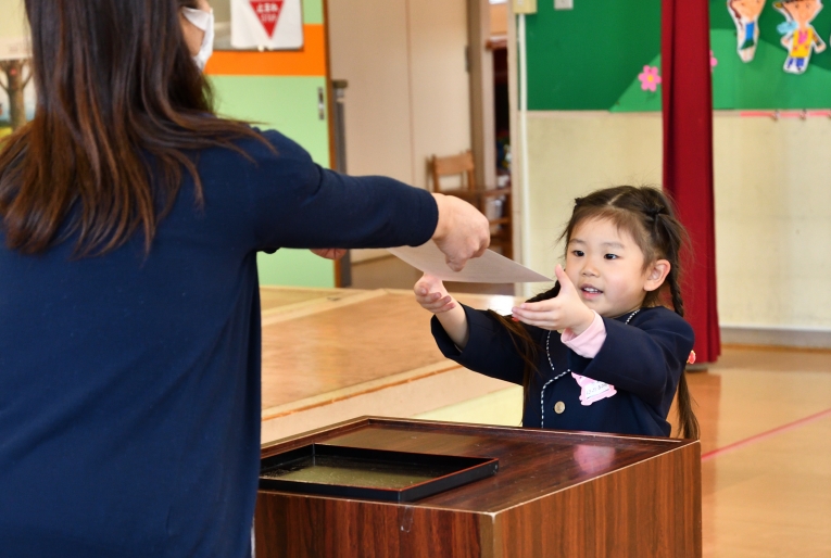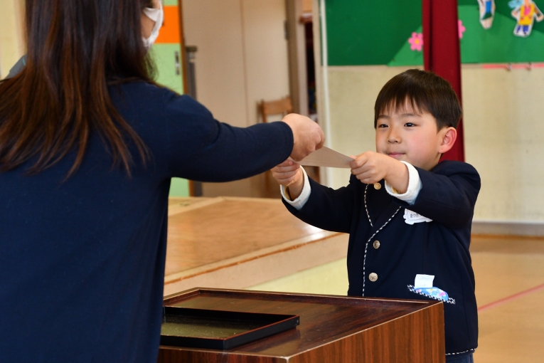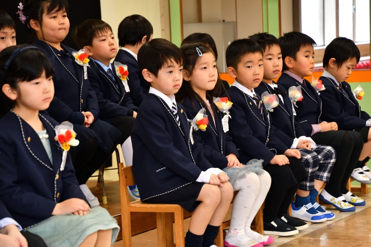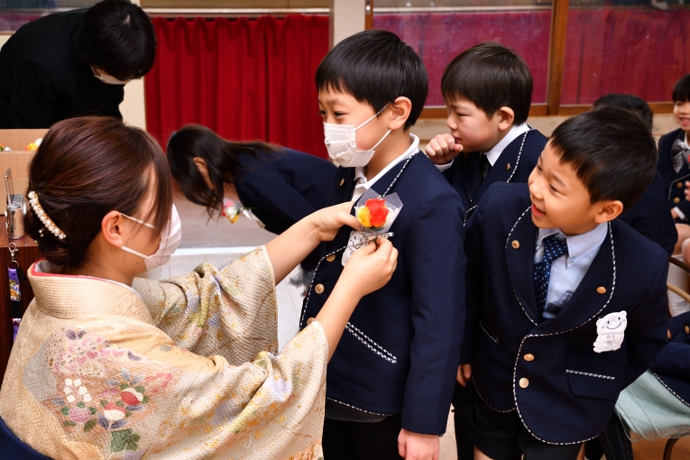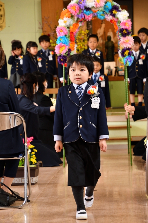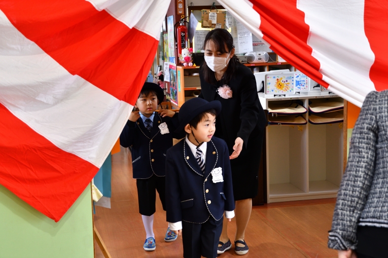 「おはよー!」元気な年長さんが、わくわくドキドキの子どもたちがスーツや着物姿のお父さんやお母さんとやってきます。