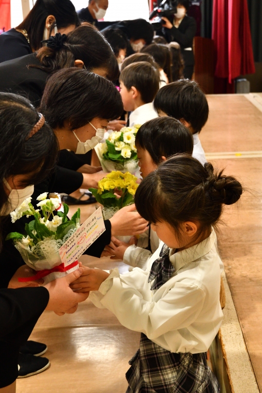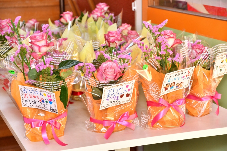 ホームルームが終わったら、ホールでパパやママが待ってるよ ほらほら みんなでこっそり用意していたお花。