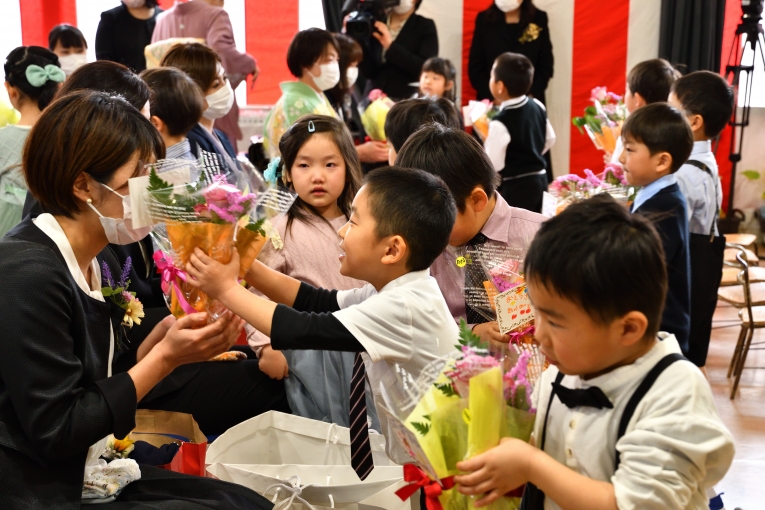 じゃあ最後はね 先生たちからみんなへ・・・ 今日からみんながこのお花の「パパとママ」。大切に育ててね。毎日「綺麗だね」って褒めてあげてね。お水とお日様を忘れないであげてね。全部の先生からのメッセージと一緒にプレゼントです。