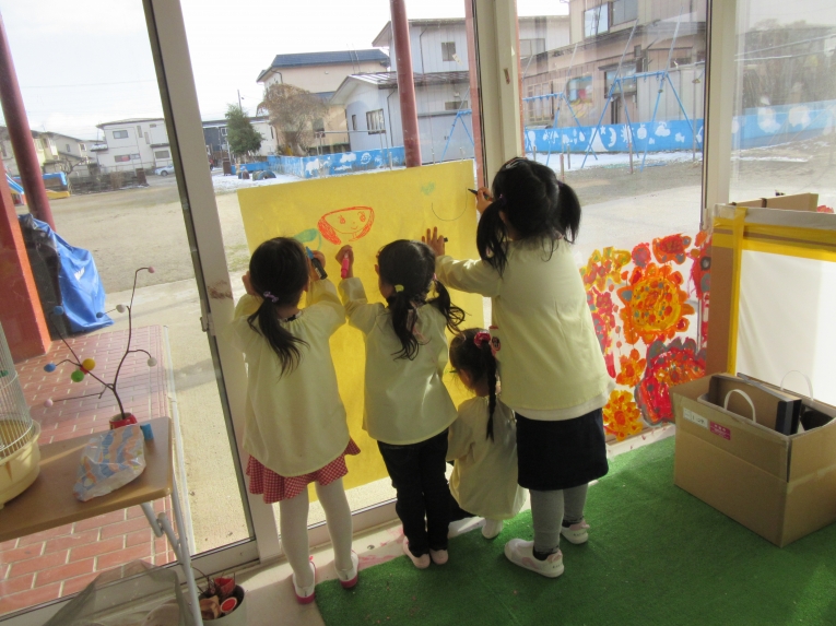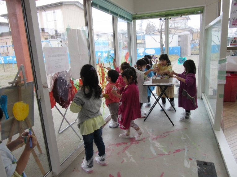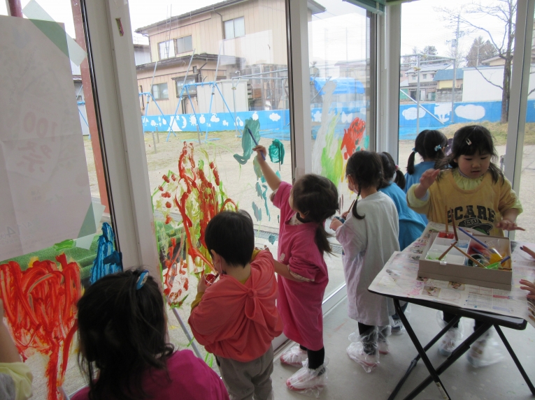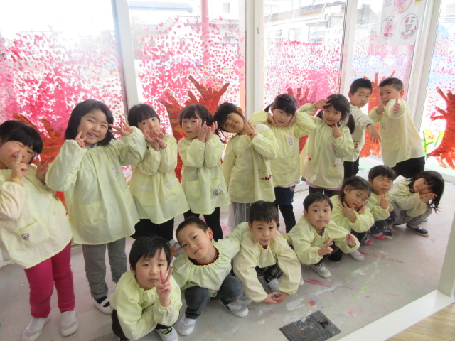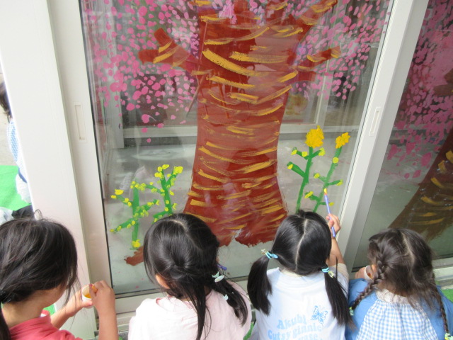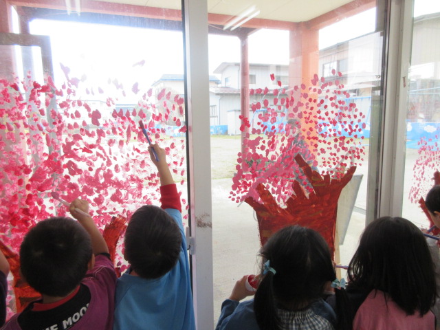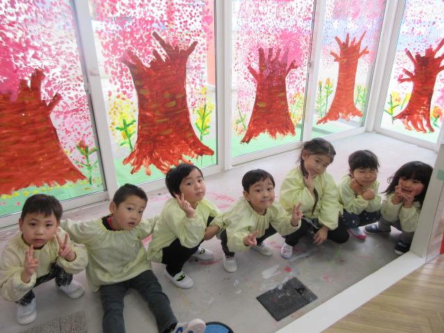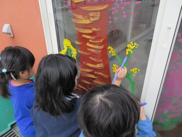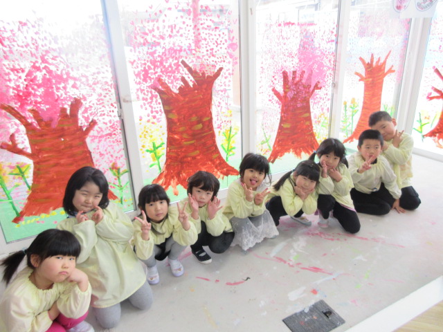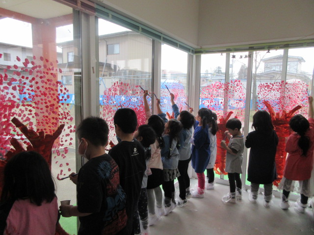 そして、今日は卒園する ゆき組さんに お祝いのプレゼントを うめ組みんなで作りました本来ならば、卒園式に在園児代表で出席するのですが、今年度は様々な理由により、出席できません。それならば!と、アトリエのガラス窓に、お祝いの桜の木を描き、プレゼントすることにしました