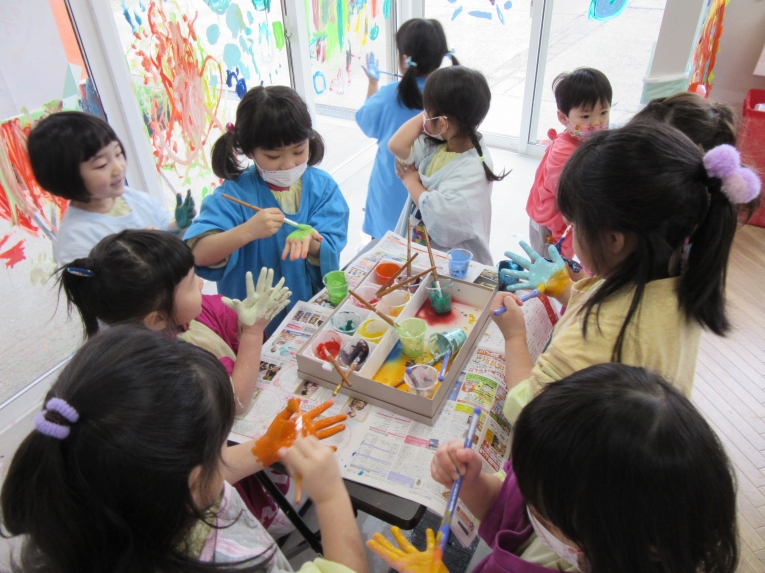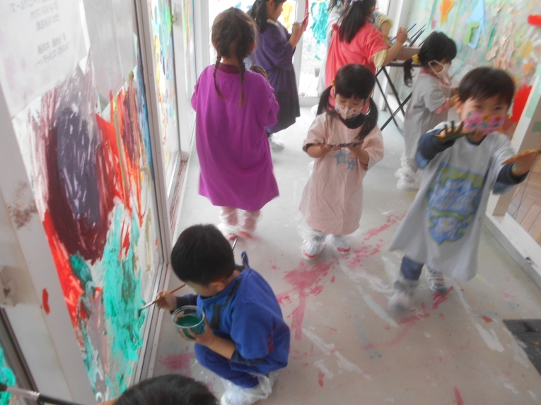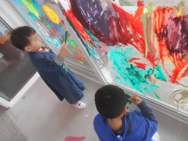 ガラスに絵の具でぬりぬり自由に描くってたのしいよね