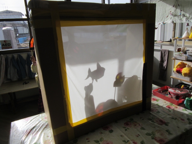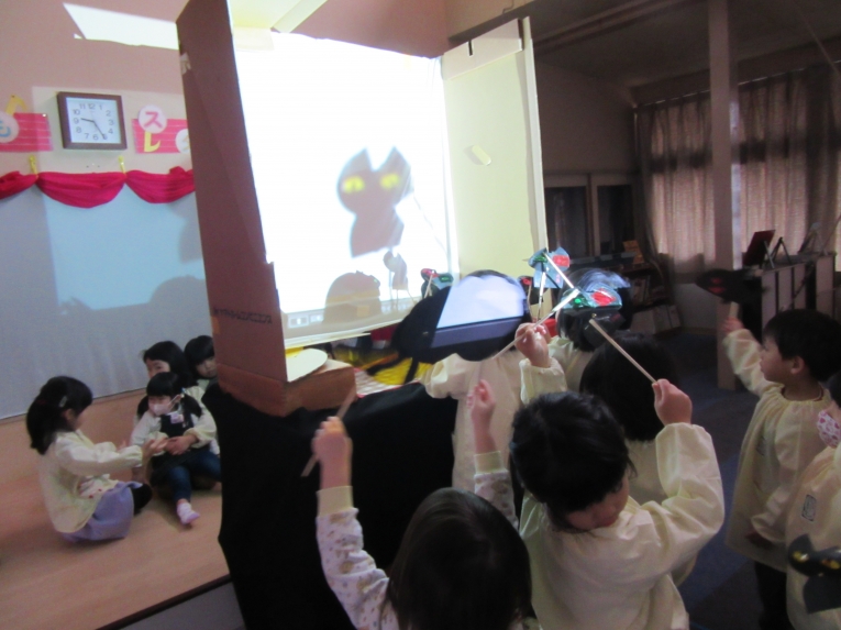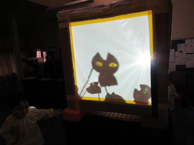 スタジオでの「影絵」上映会は、秋に来てくださった「劇団すぎのこ」さんの作品。影絵の不思議な魅力に引き込まれるこどもたち・・・ 数日後、アトリエで「影絵人形」にチャレンジしてみました。好きな色のセロハンを張って、割り箸と割ピンで、首が動くようにして・・・