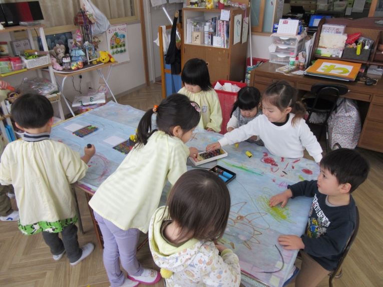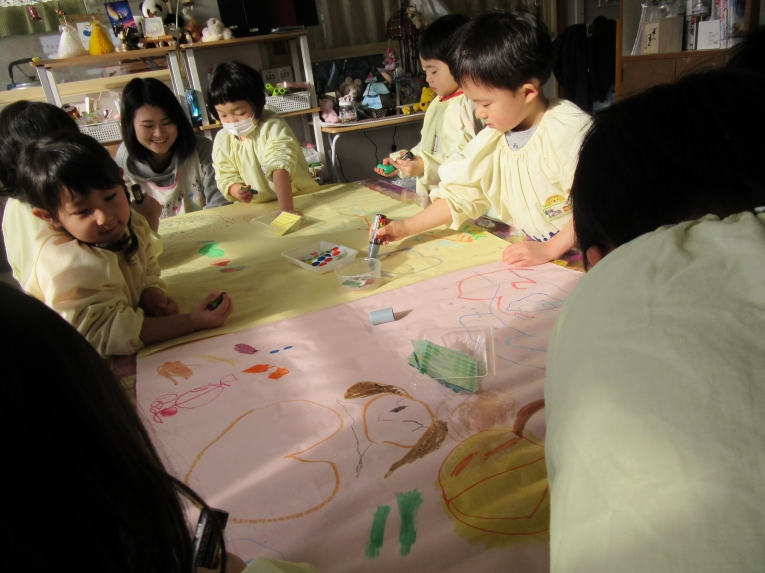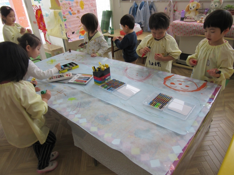 明けて翌週は、いろんな素材でお絵描きしてみよう大会!!大きな大きな模造紙をテーブルに拡げて・・