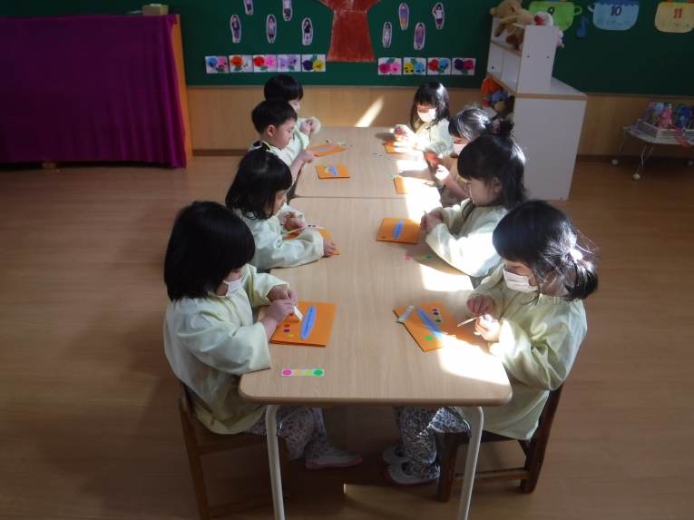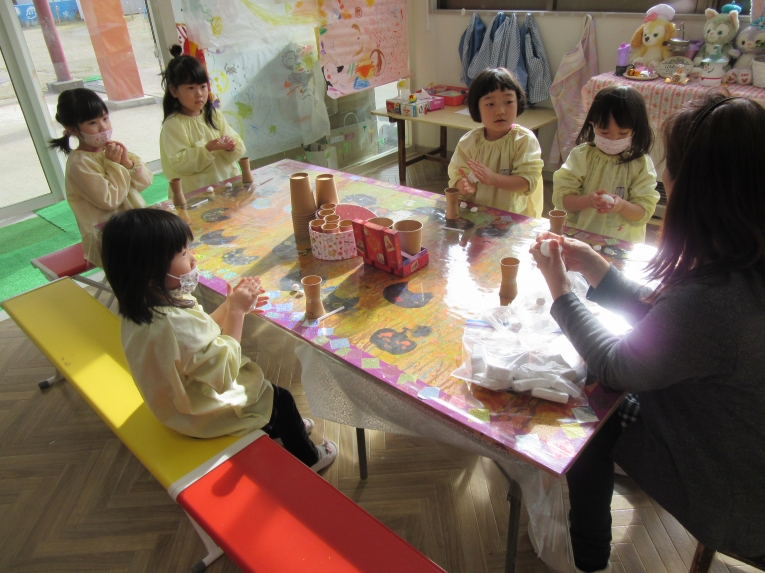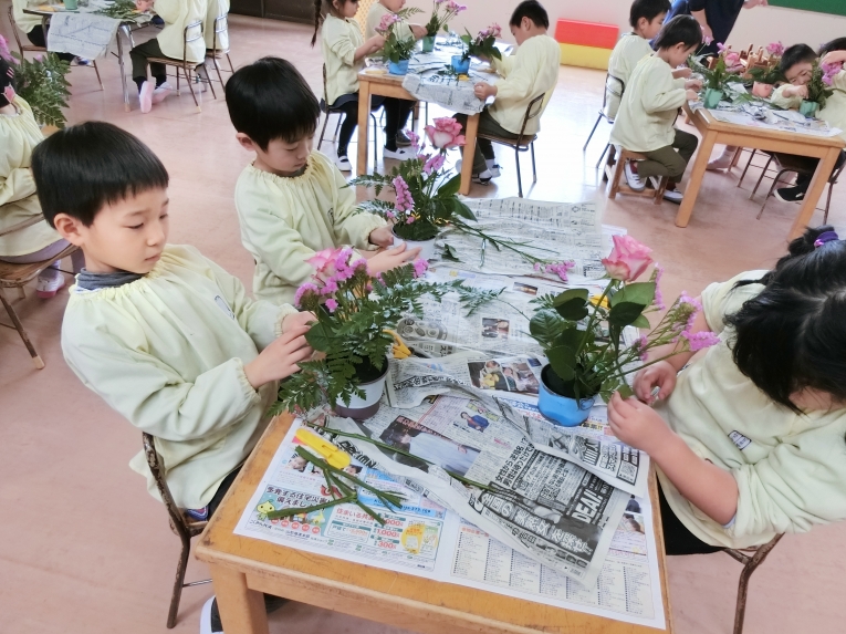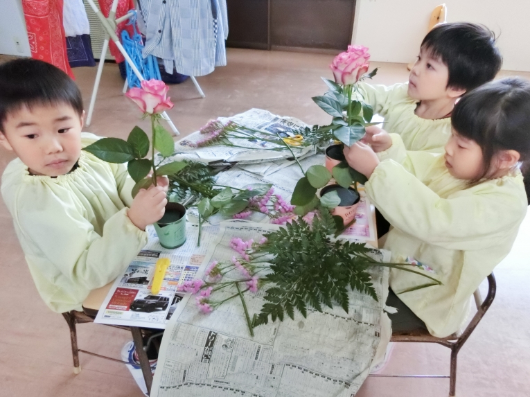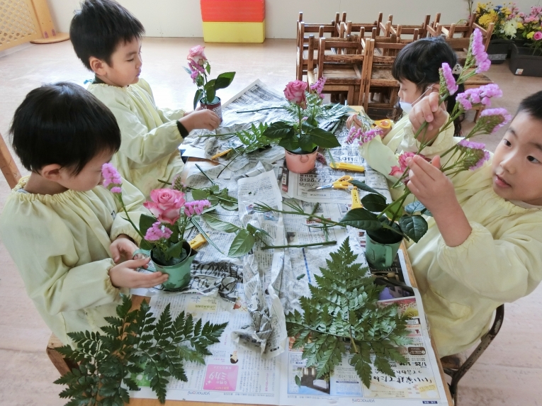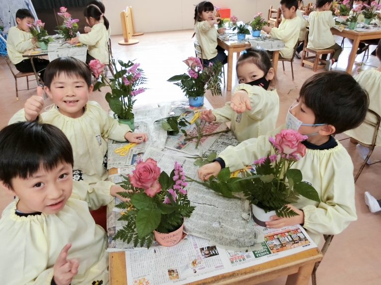 卒園式でお家の方へサプライズするお花を、まなみ園長先生に教えていただきながら作りました♪卒園式当日まで、みんなちゃんと内緒の約束守れたね各テーブルに一人ずつ女の子たちが入って、男の子たちに教えてくれるところもありました