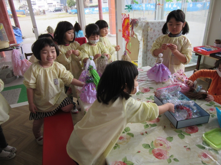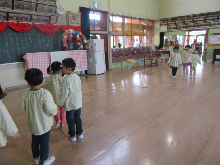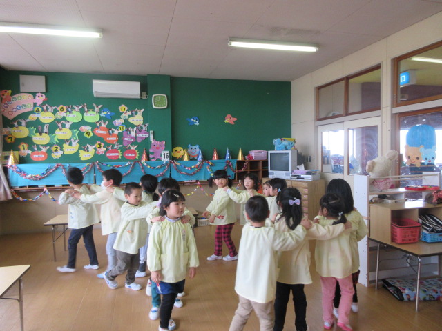 お部屋の装飾も、ゆきぐみさんとのお別れお楽しみ会用にみんなで作った、輪飾りを再利用し、お部屋の飾りつけもみんなで行いました