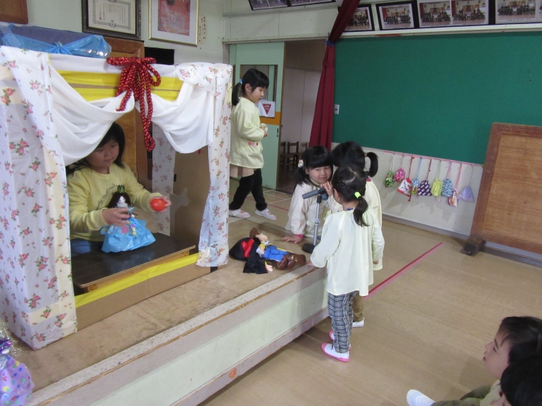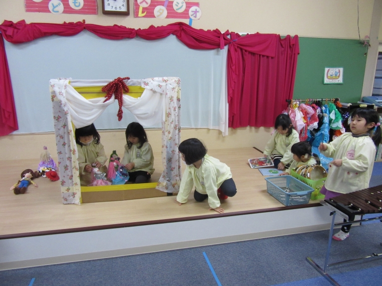 プリンセスができたら、やっぱりお人形あそびだよね。アトリエでは狭いから劇場を作って、ホールであそぼ!みんなでわいわい持っていったら、あららら・・続々お客さんが・・・