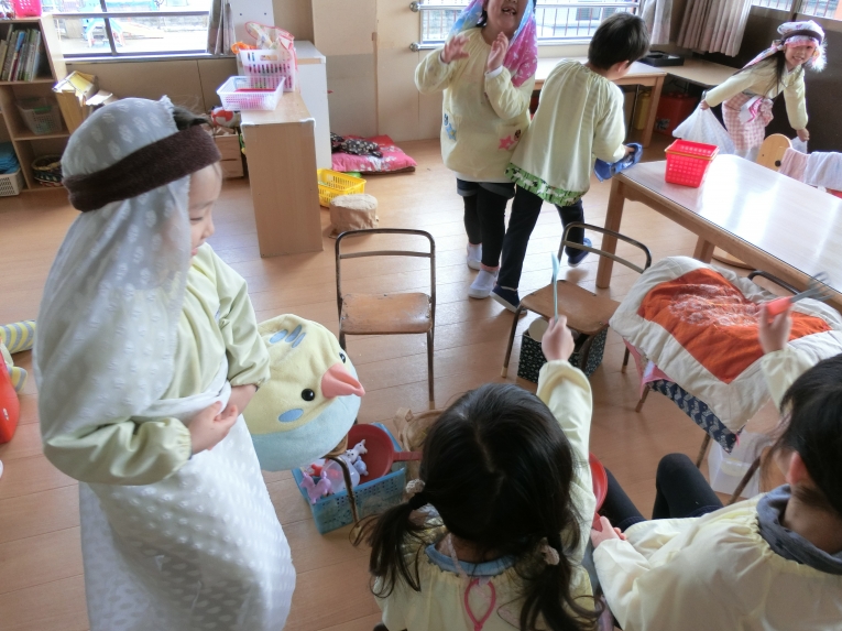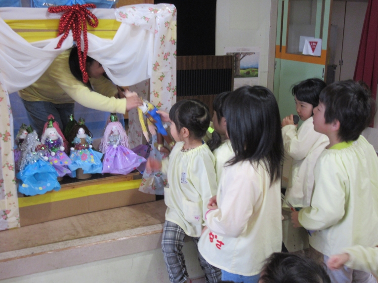 ナレーションと音楽に合わせて「しらゆき姫」が始まります。みーんな白雪姫になりたくて、怖ーい魔女は先生。