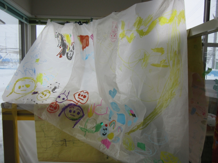 うすーーーーーいトレーシングペーパー(のような紙)にも描いてみたら、素敵なカーテンができました