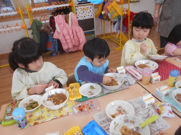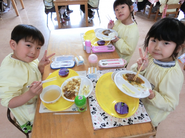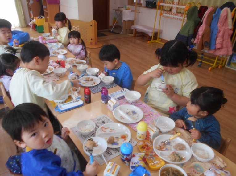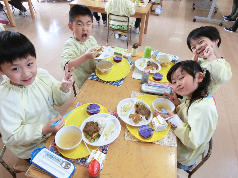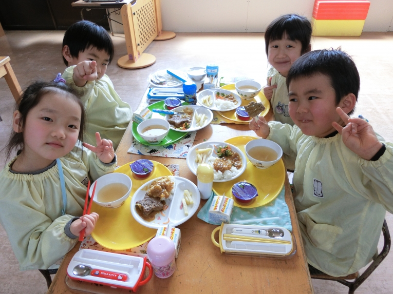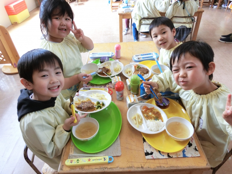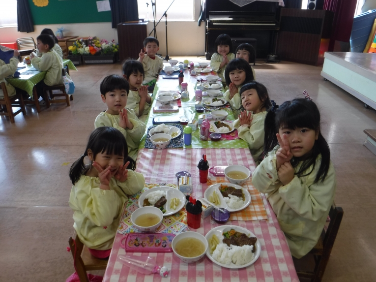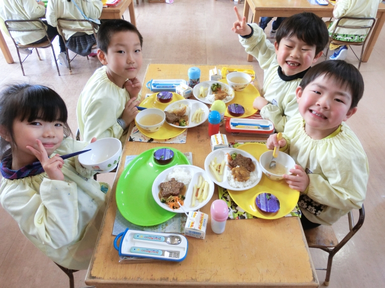 最後の給食だと伝えると、「え~~~!」とみんなから残念がる声が沢山ありました(>_<)でも最後のメニューはお星さまハンバーグにフライドポテト!おかわりも沢山して、お腹いっぱい味わって食べていましたよ
