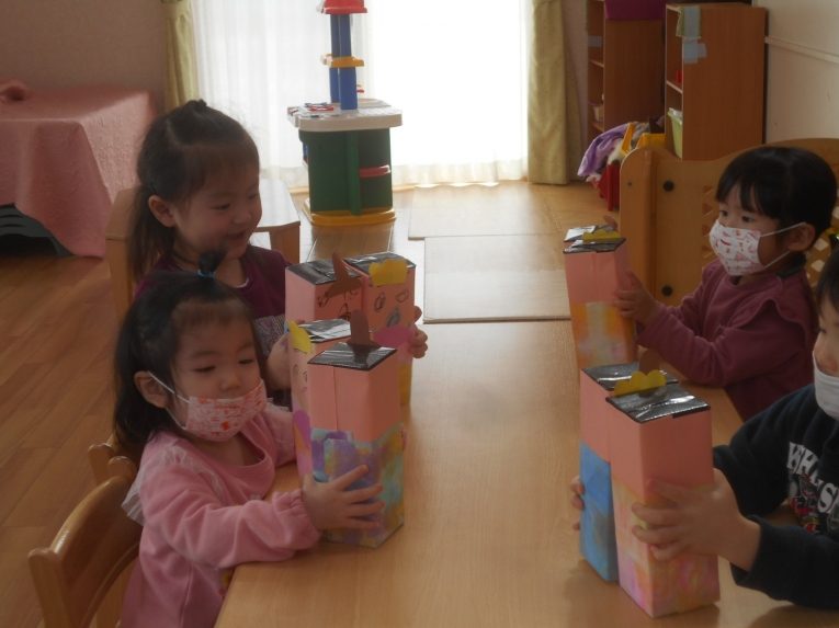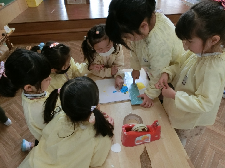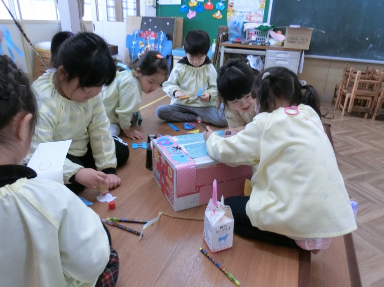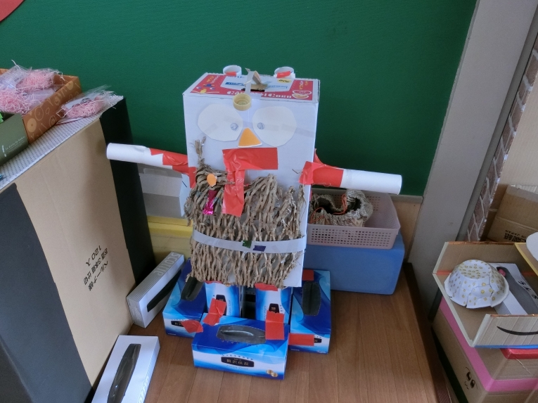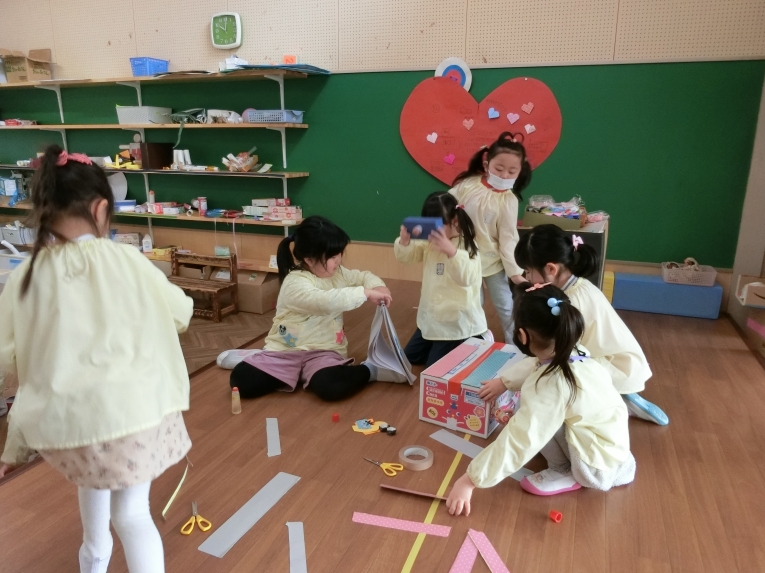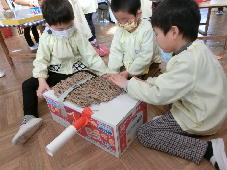 最近歌った「みんなともだち」という歌の中に「みんないっしょにロボットをつくった」という歌詞があり、そこからロボットを作りたいという子たちが集まり、ロボット作りが始まりましたどんなロボットにするか下書きをして、素材を話し合いながら選び夢中になって作っていましたよ(*^^)v男女で発想も作り方も違く、そこもまた面白いな~と見ていました!女の子たちはじっくり時間をかけていて、間もなく完成の予定だそうです♪