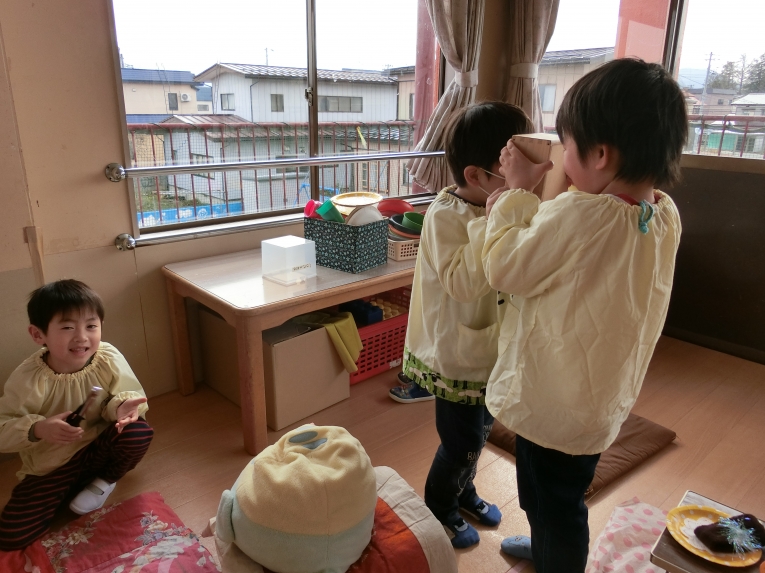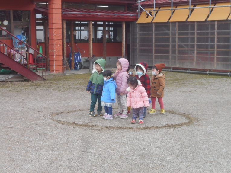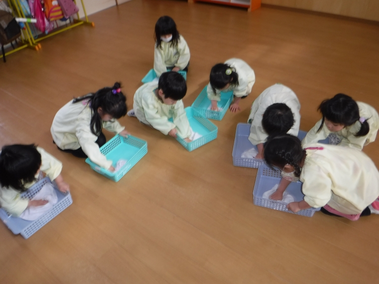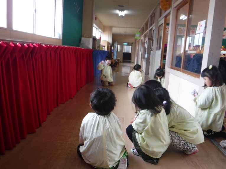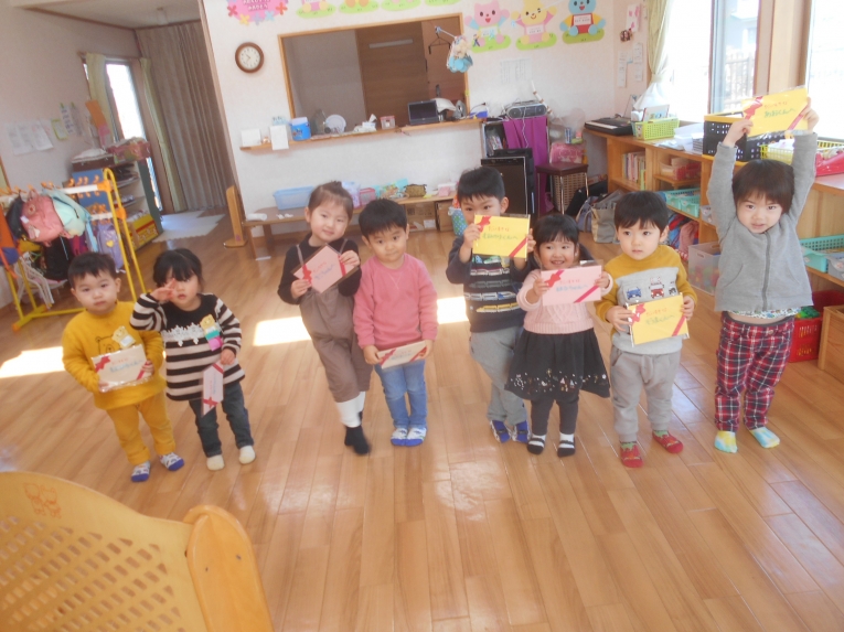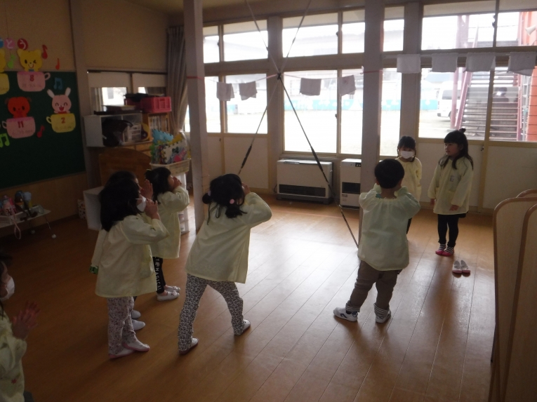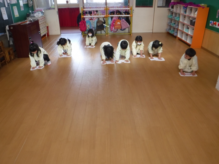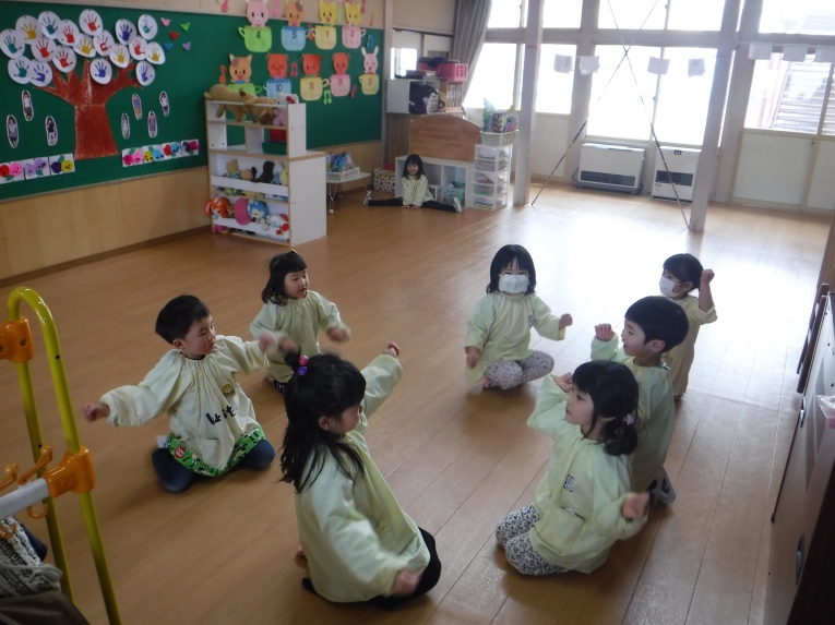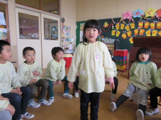 3月に入り、もうすぐ年長さんだねとワクワクしているうめ組さん。お別れお楽しみ会を企画し、進行したり、年長さんが踊った踊りを内緒で練習し、ゆき組さんをびっくりさせたり、大成功!卒園式の練習にも参加し、たくましい姿を見せてくれました。