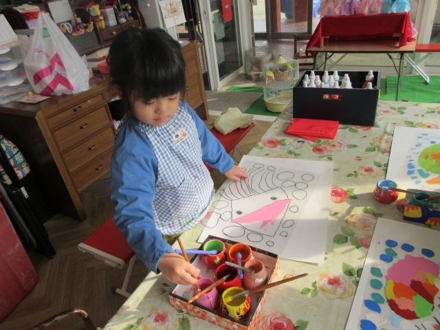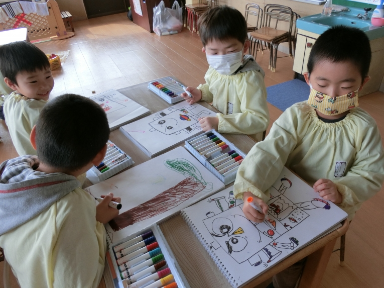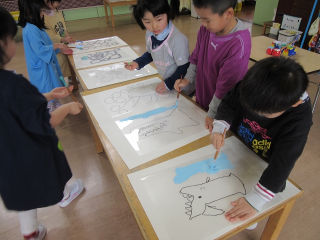 まわりは海っぽく塗ろうね。どんな色にしようかな?ここは色を変えたいな! さまざまな声が聞こえました