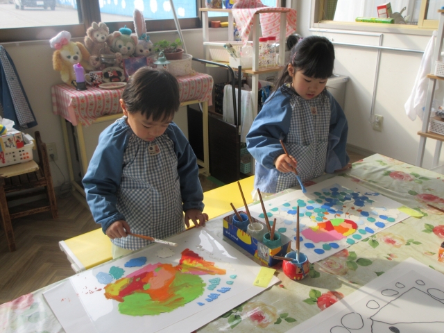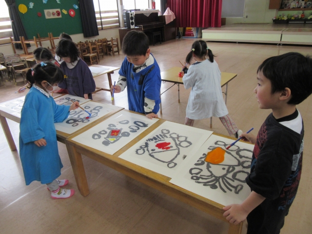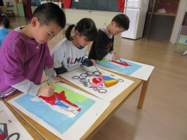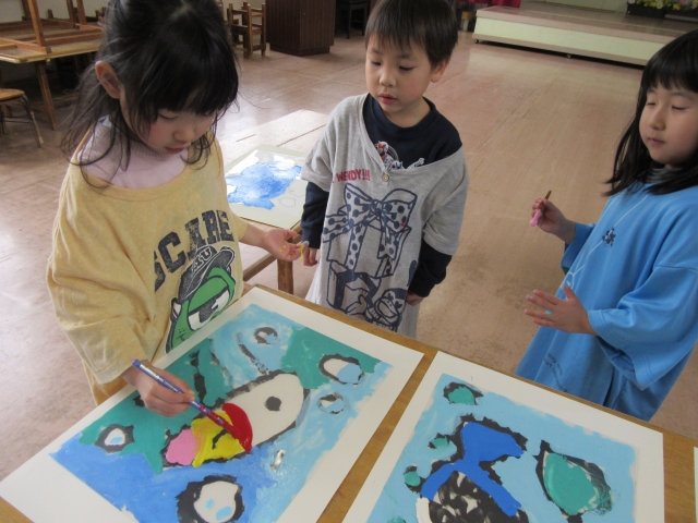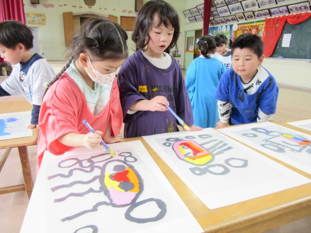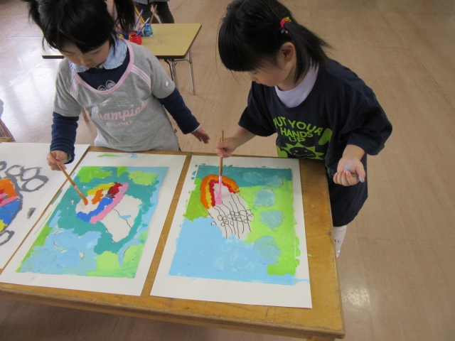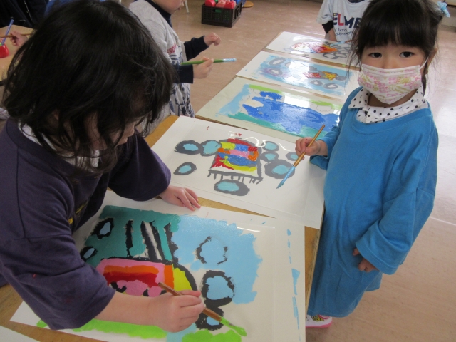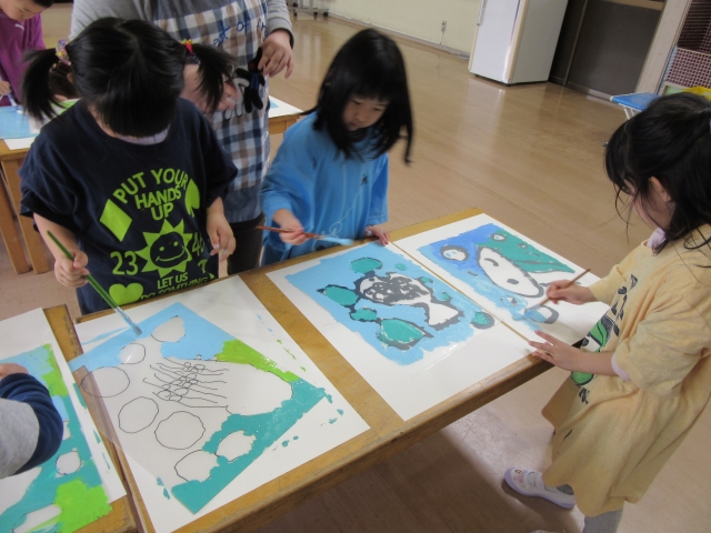 2月末、海の生き物を描いたところに、カラフルの絵の具で色付けをして、すてきな「ステンドアート」が出来上がりました