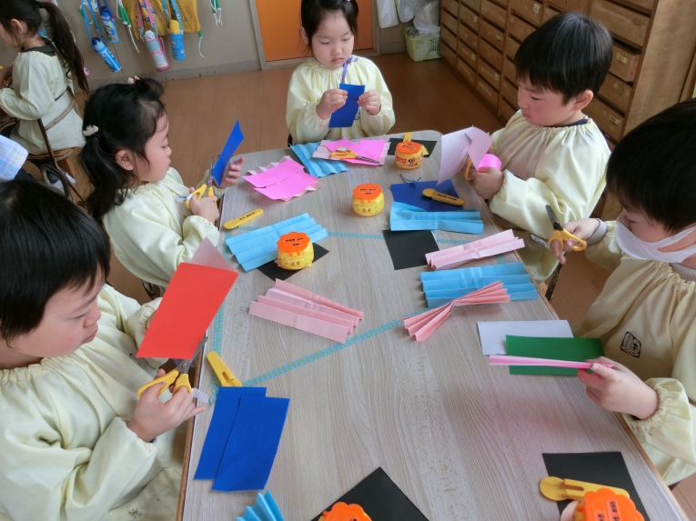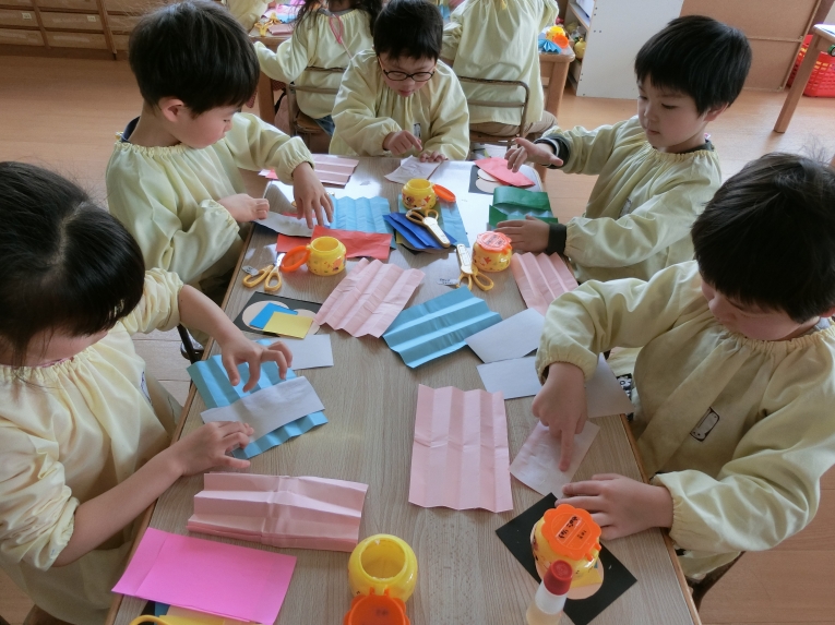 三月初めのひな祭りに向けて、おひな様製作をした時の様子をお伝えします今回はじゃばら折りのおだいり様とおひな様をつくりました!まずは、じゃばら折りを丁寧にし、その上に、選んだ色の折り紙を貼りました!折り紙の上にはキラキラテープで飾り付けをします
