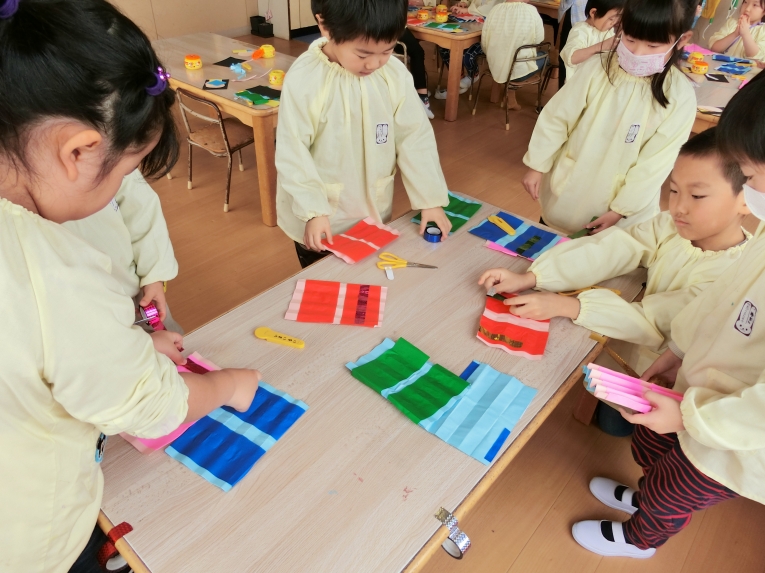 「おひなさまに飾られているこの餅はな~んだ!」と聞くと、「しかくもち!」「さくらもち!」ひしもちということを知りながら、少しずつ画用紙をずらして台紙を作り完成です
