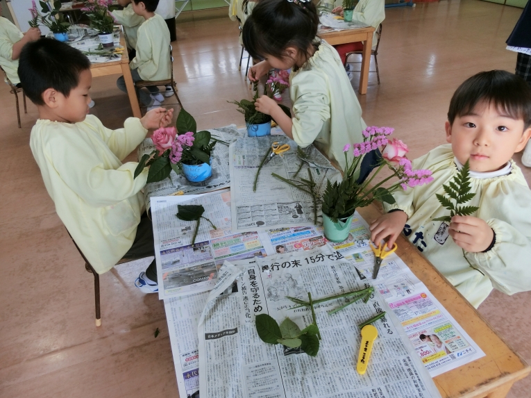 自分たちで、どのくらいの長さにしようかな このお花はこの場所かな と考えながら活けました