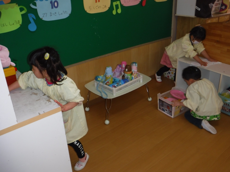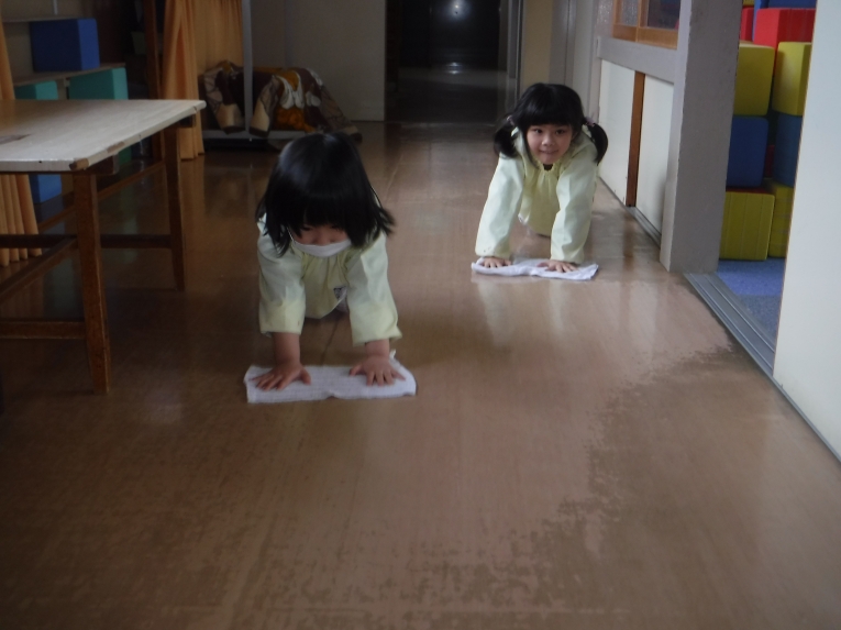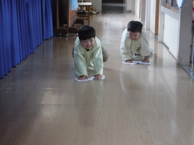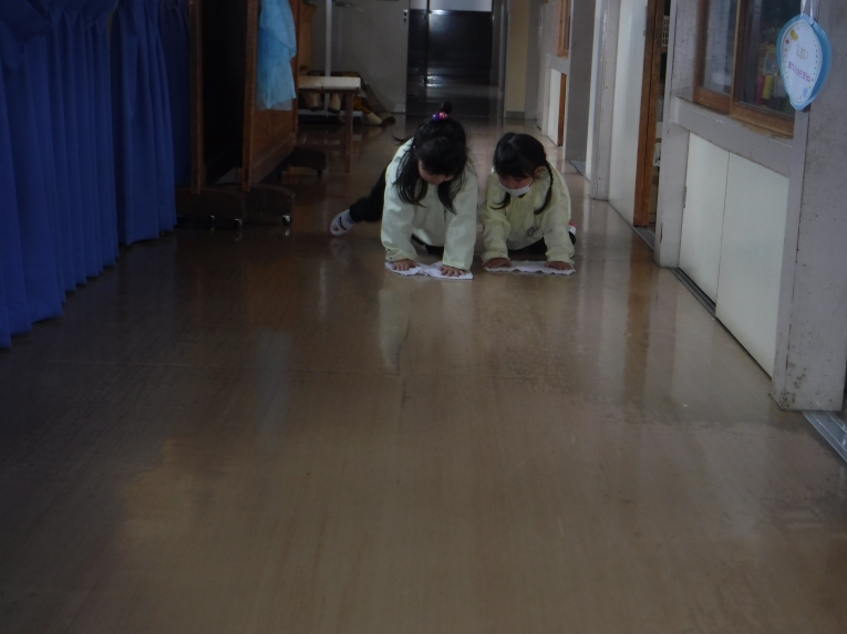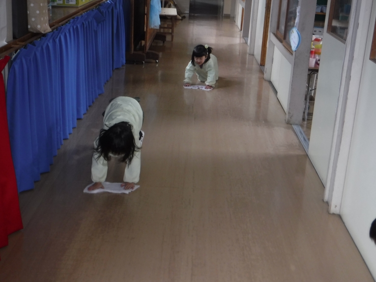 みんなで他に使った場所を探して、お部屋の前の長い廊下を雑巾がけしました
