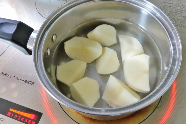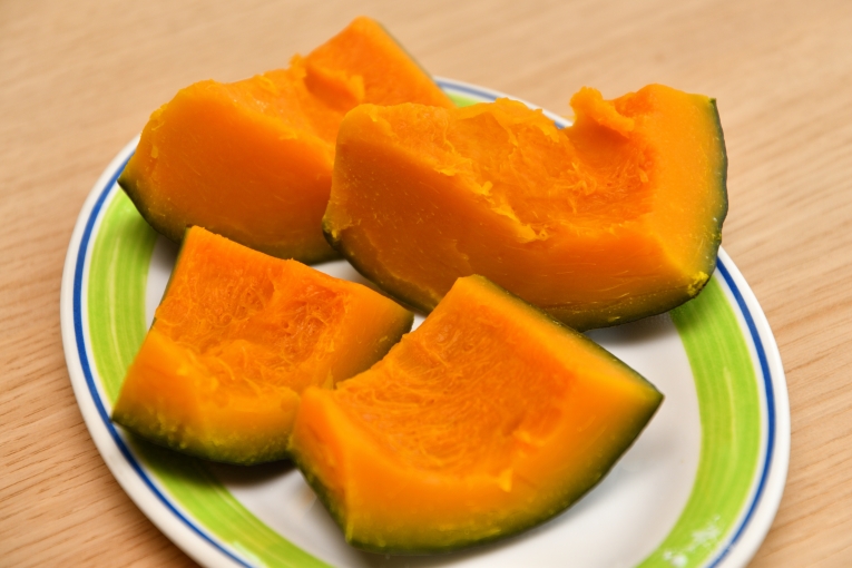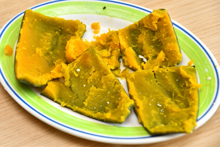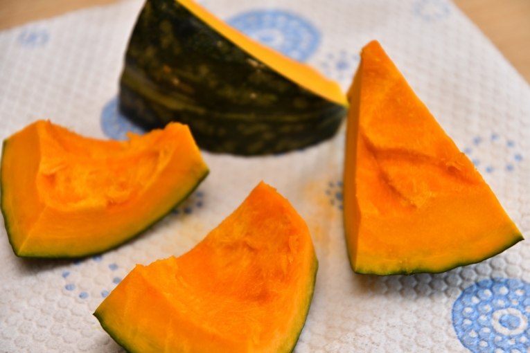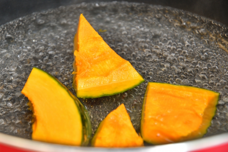 まずかぼちゃ。かぼちゃは大きめに切って(小さいとすぐ崩れます)たっぷりのお湯でゆでます。