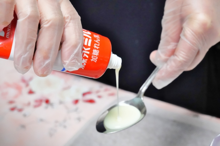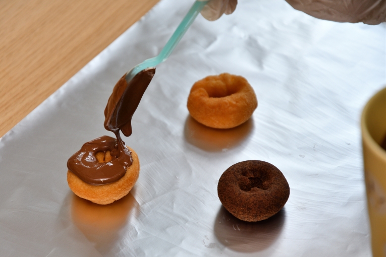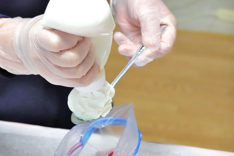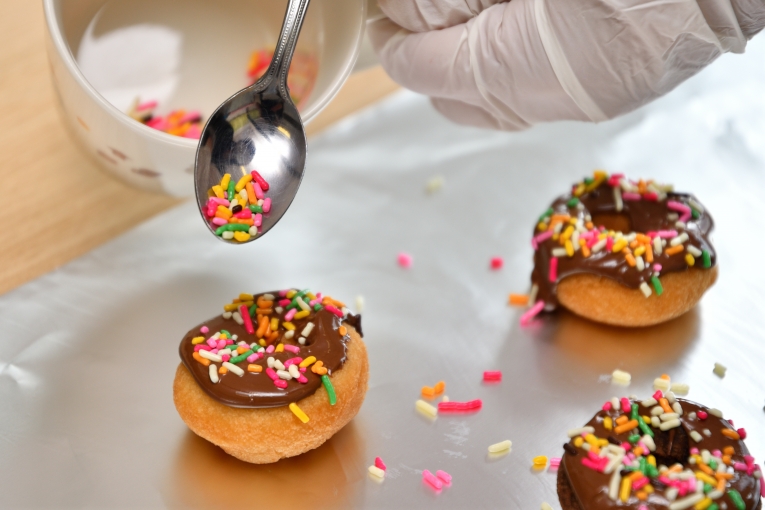 今度はチョコスプレーをパラパラしていきます。幼稚園では、スプレーを袋から別な容器に入れて、スプーンでかけてみました。