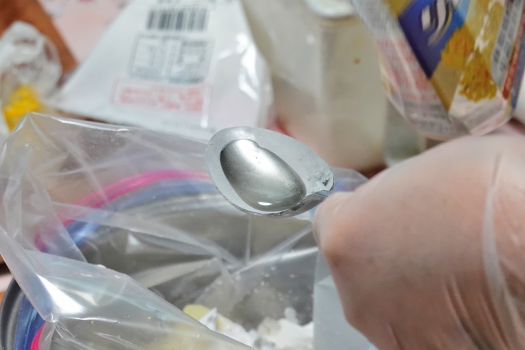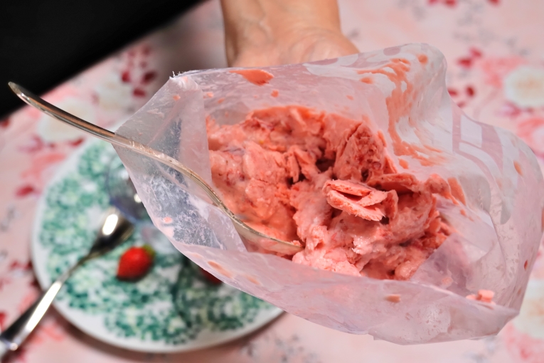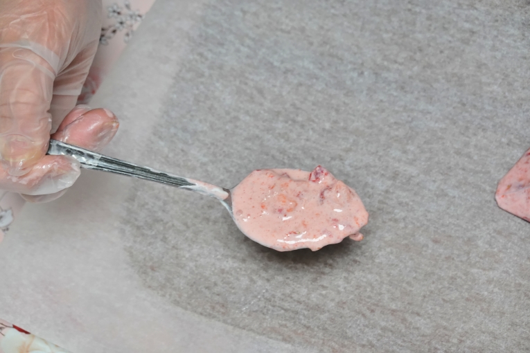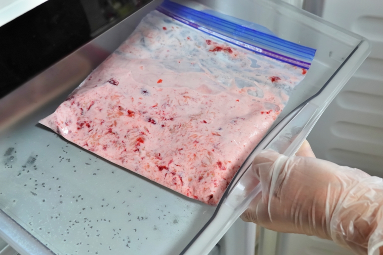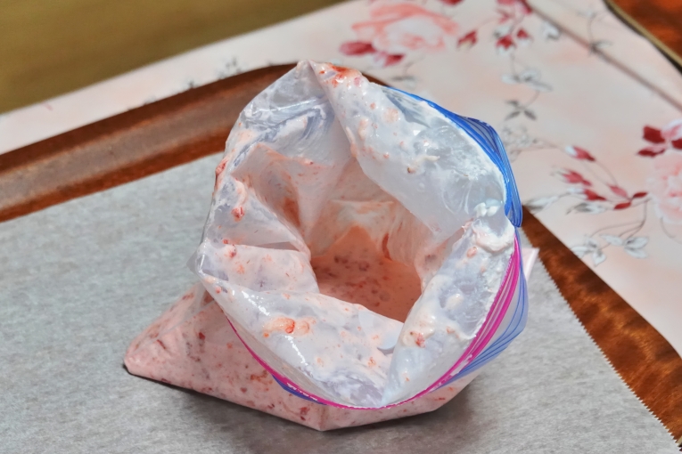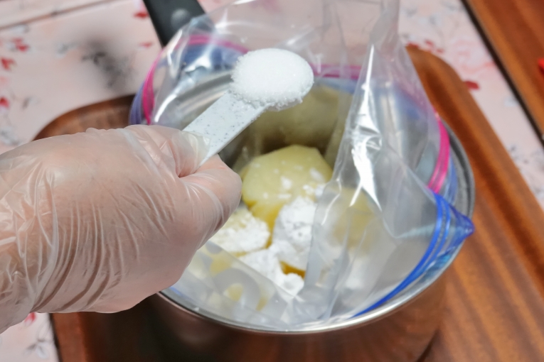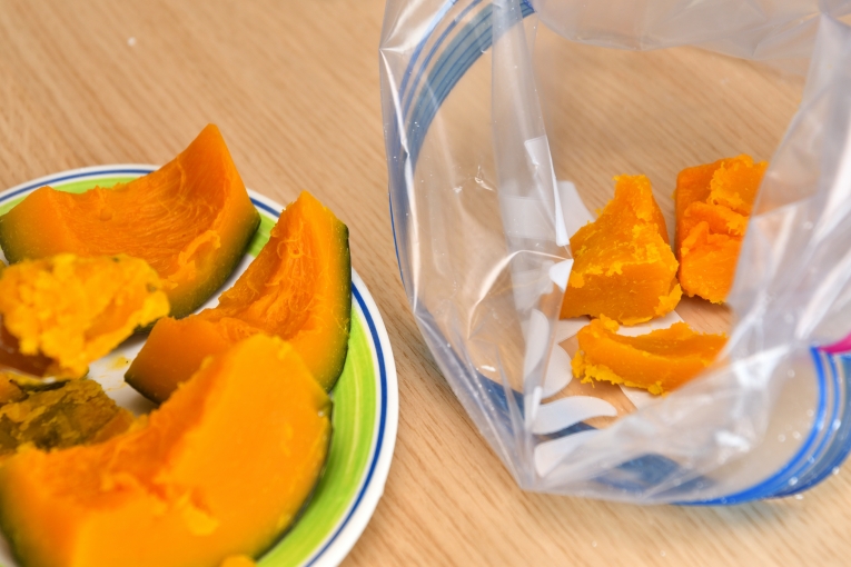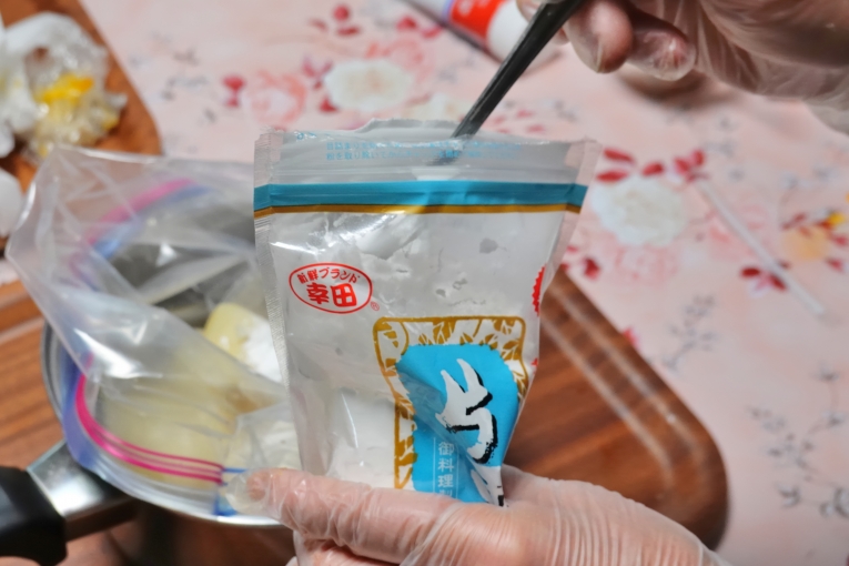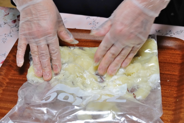 柔らかくなったらお湯から救い出してそのまましばらく放置。水気が無くなったらスプーンですくってジップロック(アイラップでも大丈夫)に入れていきます。