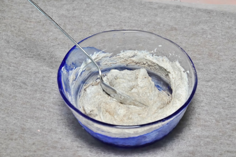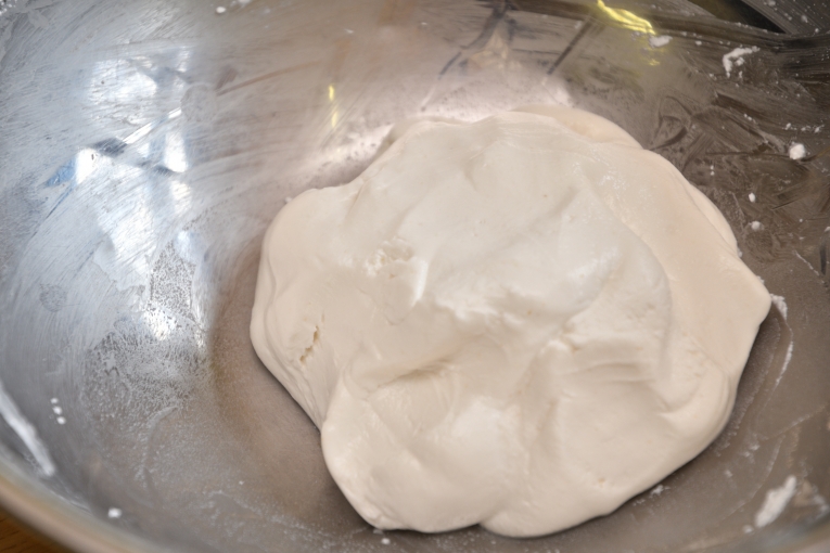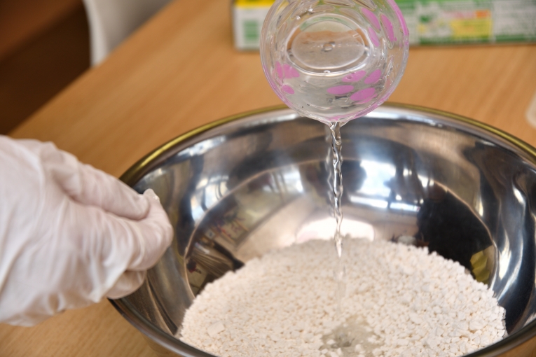 粉をボールに入れて、分量(袋に書いてあります)のお水を注ぎながら、耳たぶくらいになるまでよくこねます。