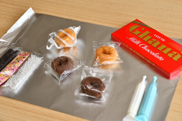 先ずは材料 1、市販のミニドーナッツ 2、板チョコ 3、チョコスプレー 4、アラザン(砂糖菓子)やチョコペンも素敵
