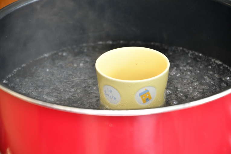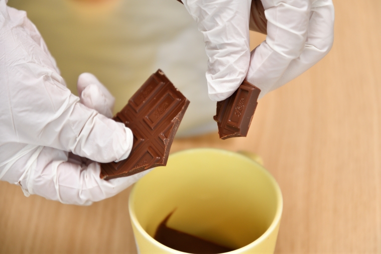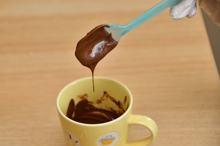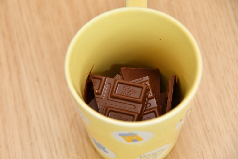 板チョコを小さく割って陶器(高熱に強い)の中に・・ そのまま湯せんで溶かします。