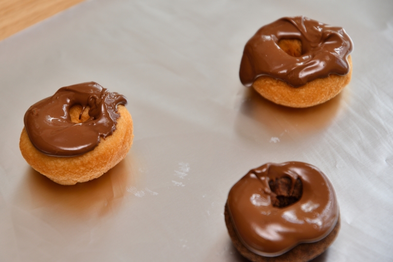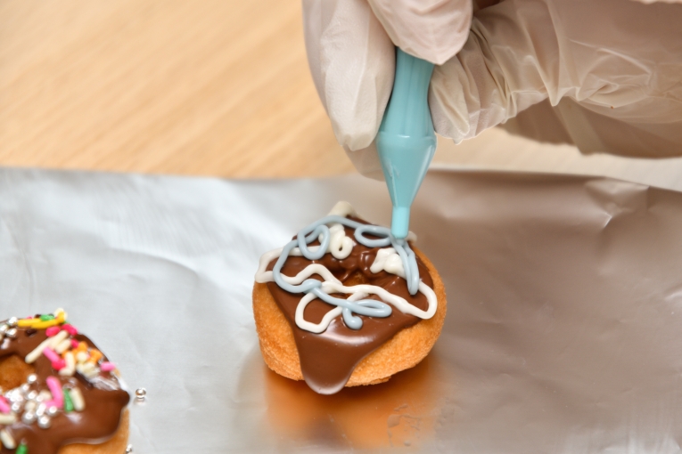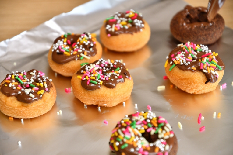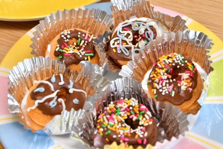 「なんちゃってカラフルドーナッツ」の出来上がり~ 冷蔵庫に入れて冷やしていただけるとチョコがパリッ!として美味しいですよー