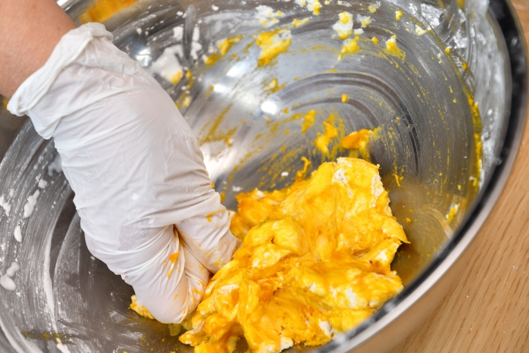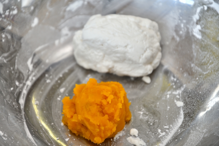 かぼちゃと白玉生地をよく混ぜ合わせてこねます~ (生地は堅めのうちに分けてください)