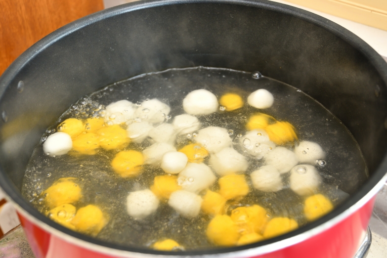綺麗な黄色い生地ができたら、小さく丸めながら沸騰したお湯に投入~ 注意:お子さんは別な場所でお団子丸め。お鍋には近寄らないように