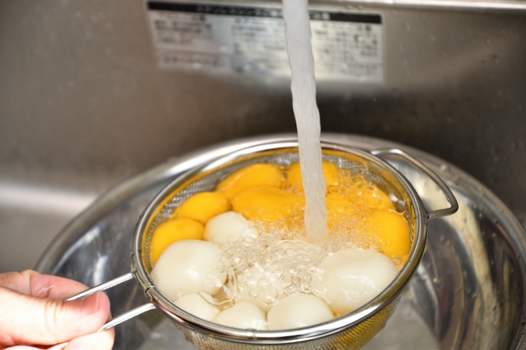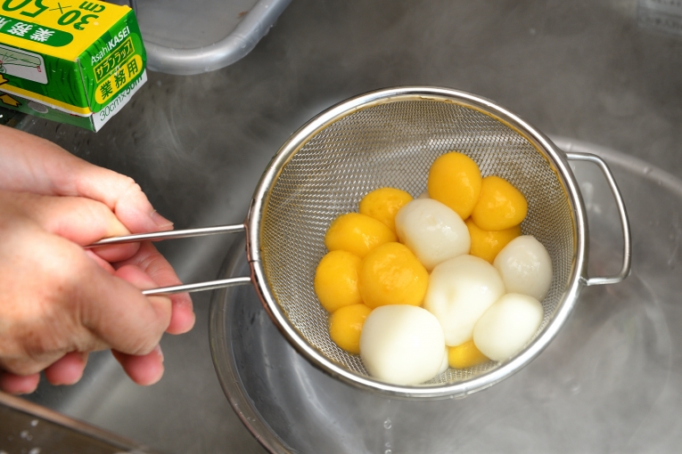 お湯の中でぷくっとふくれたら、ざるにとって、お好みで冷水にさらしたり、ほかほかのをそのままでも