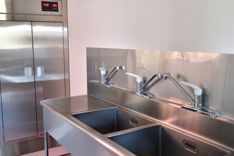 ぴかぴかの水道がいっぱい。ここは皆の大好きな給食を作る「給食室」です