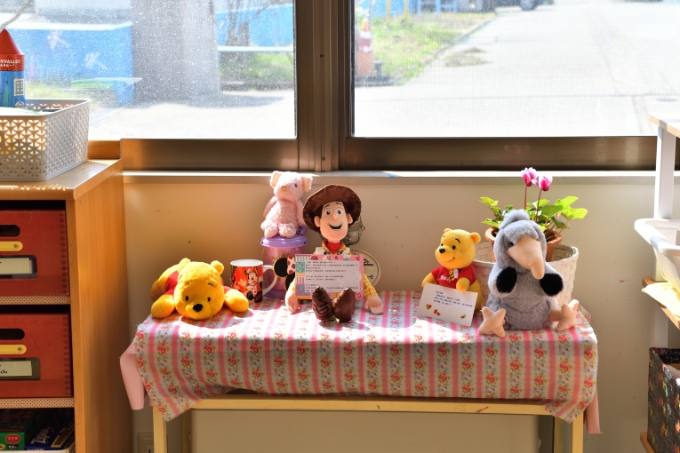 うわあ~ ディズニーの仲間たちがいっぱい!みんなの大好きなキャラクターはいるかな?ちなみに先生が大好きなのは一番左端の黄色い子♡ それからお耳だけでているバレリーナさん それからそれから・・・・・・