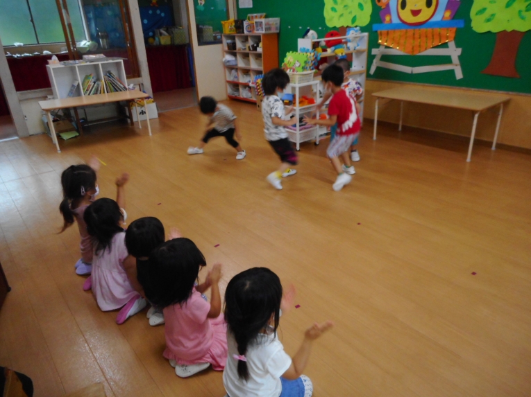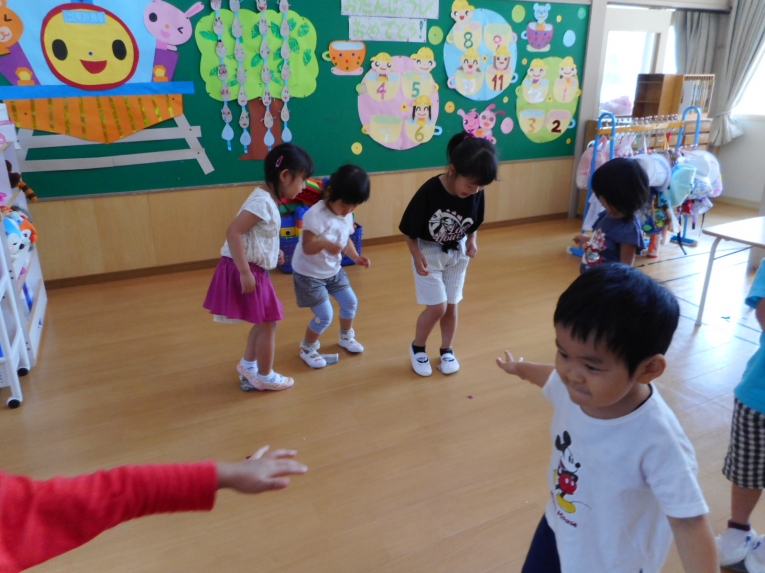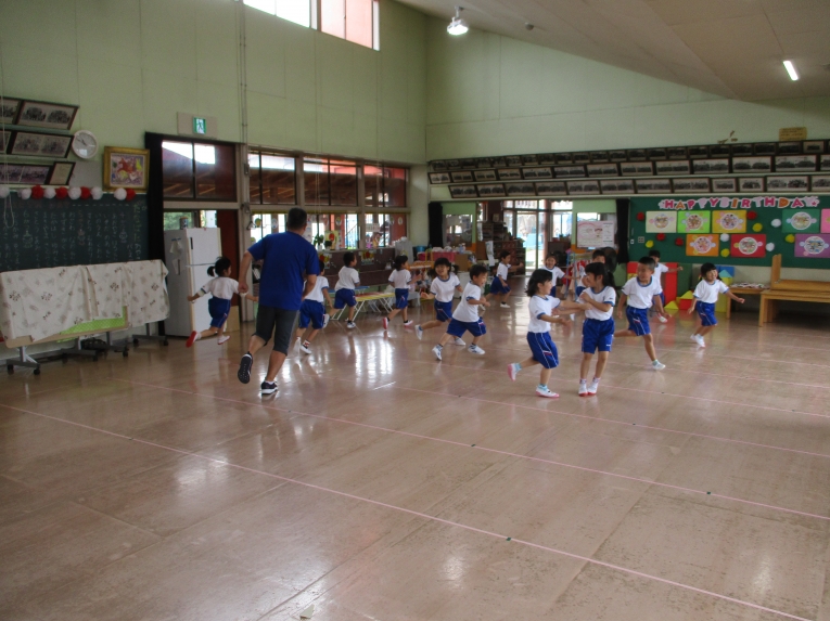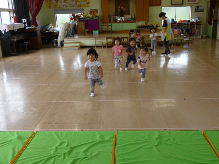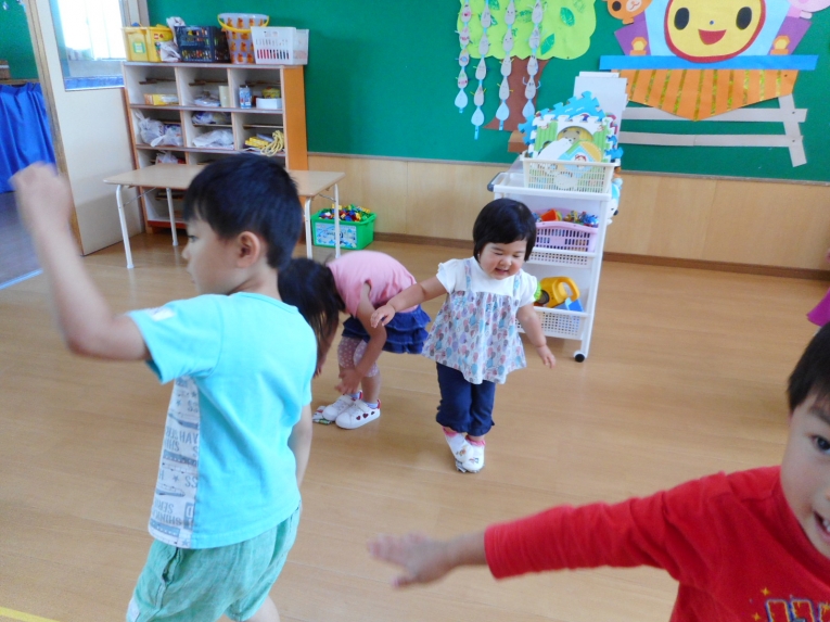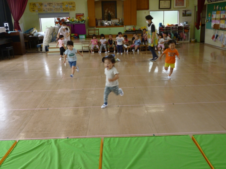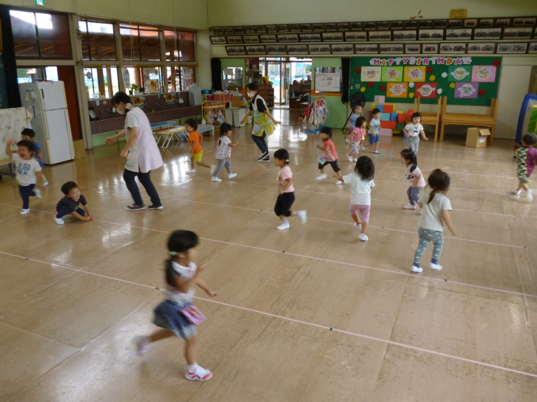 ホールで、曲に合わせて踊ったり遊んだり、よーいドン!!とかっけこしたり、楽しみました