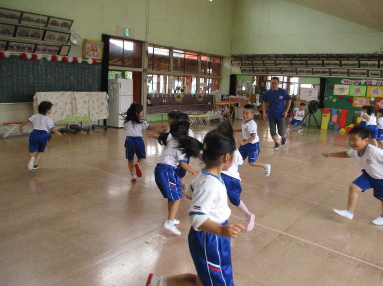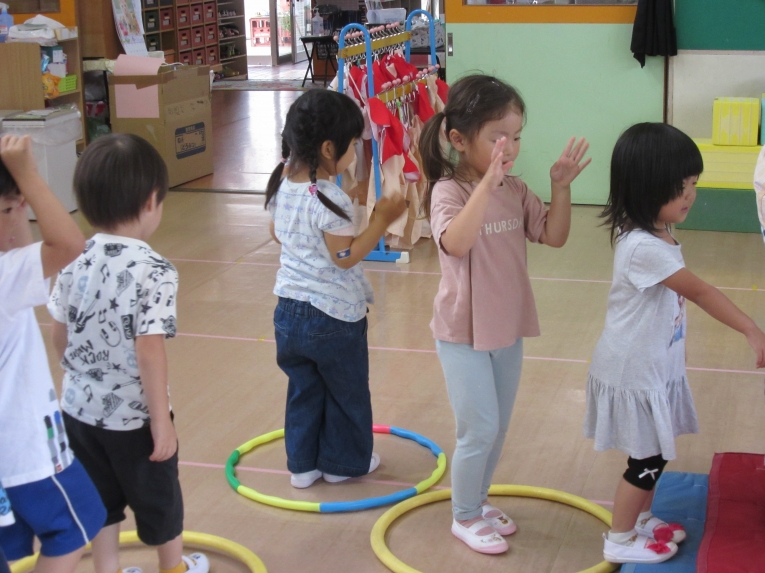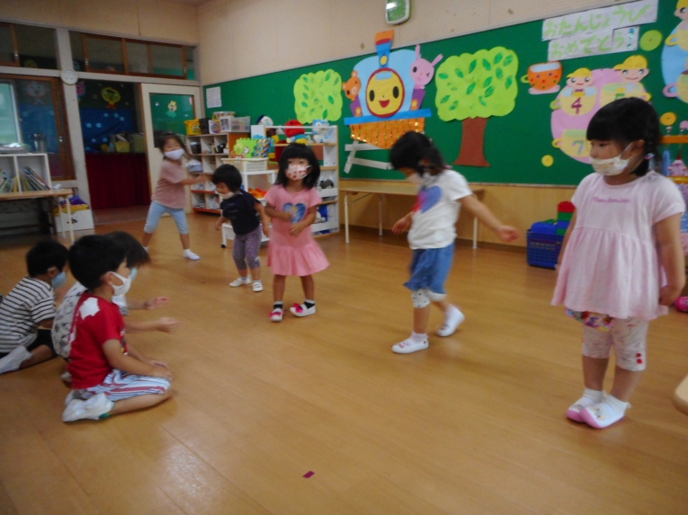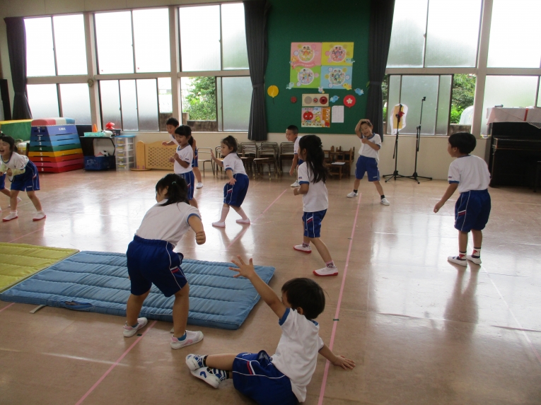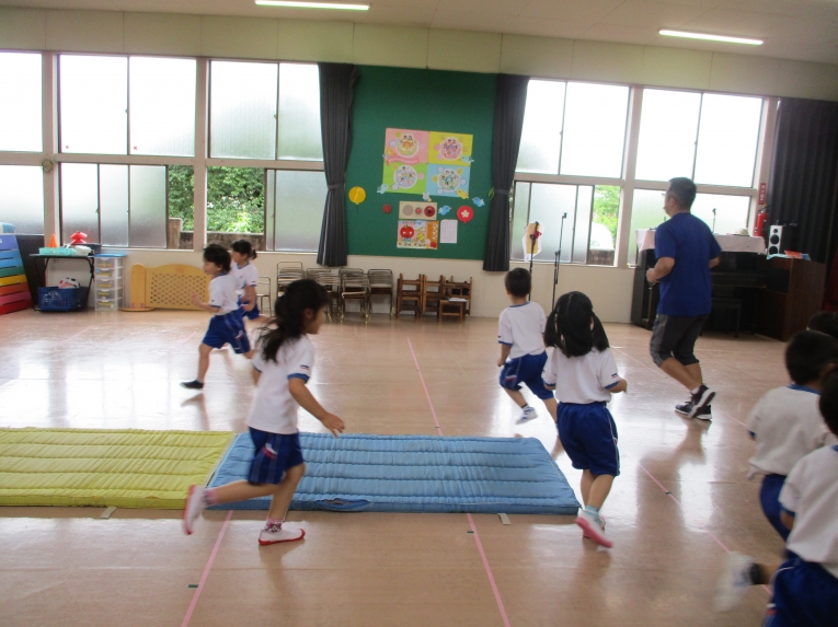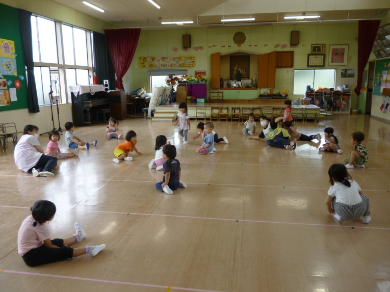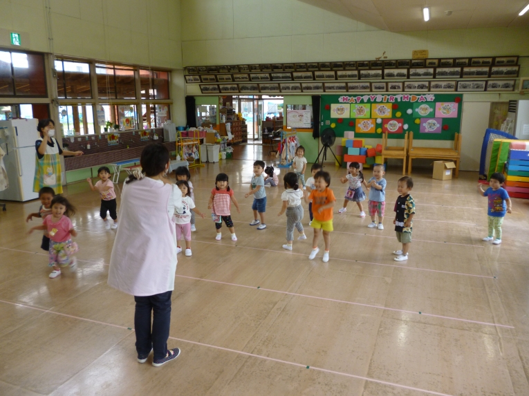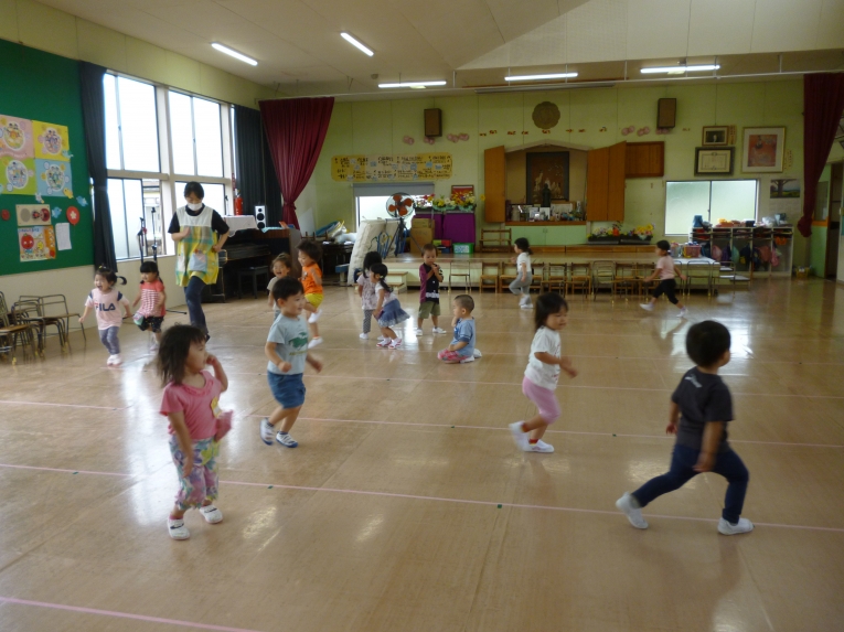 ホールで、曲に合わせて踊ったり遊んだり、よーいドン!!とかっけこしたり、楽しみました