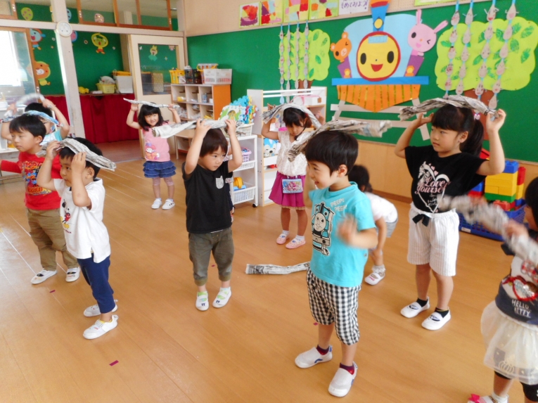 年中さんと一緒にゲームあそびもしましたじゃんけんゲームをしたり、どれだけ長く新聞棒を頭に乗せられるかなど楽しみました!
