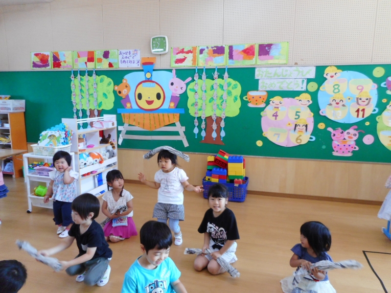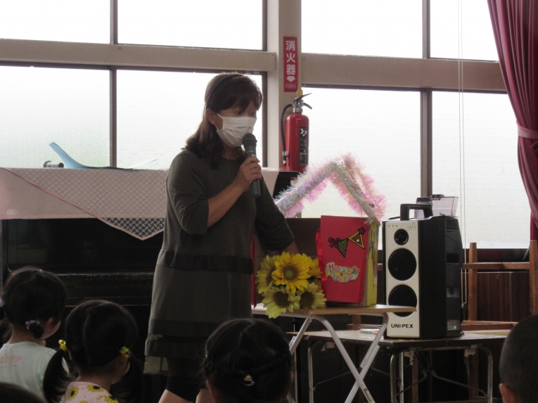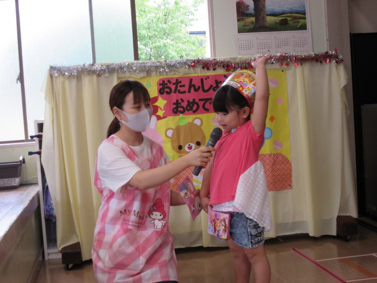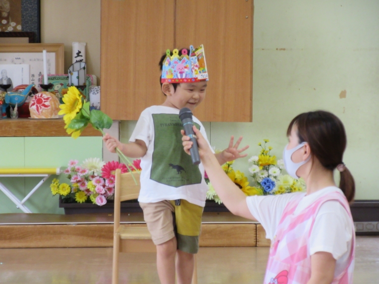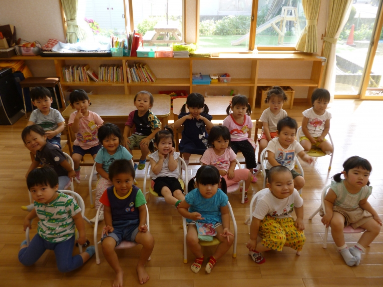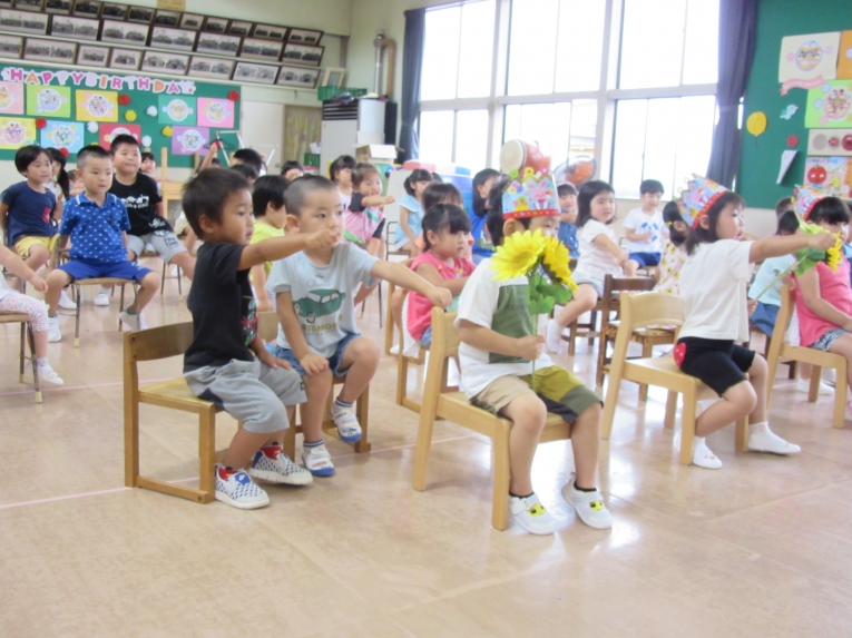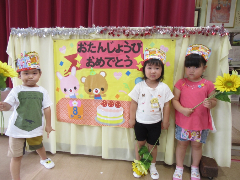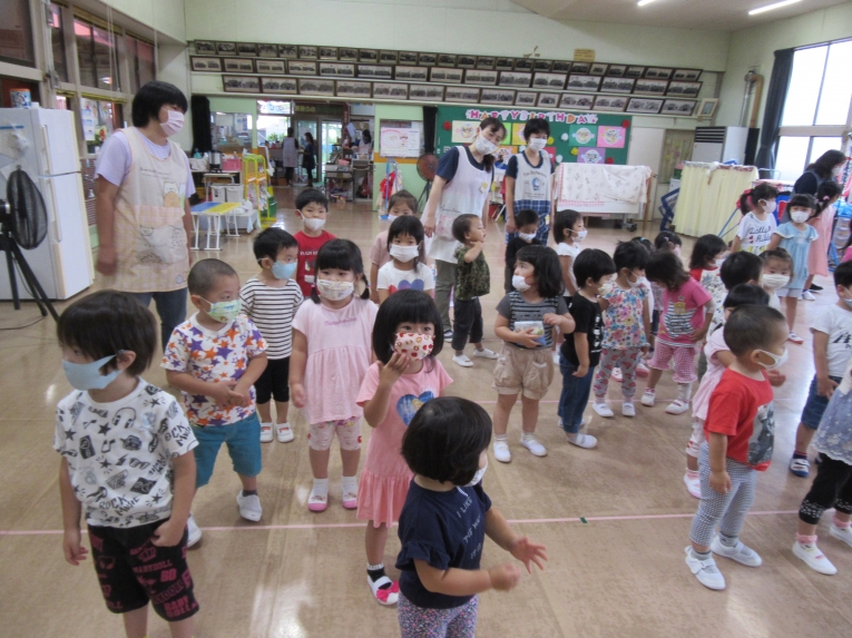 今日は8月生まれのお友だちの誕生会でした。7月にできなかったお友だちも、一緒にお祝いです