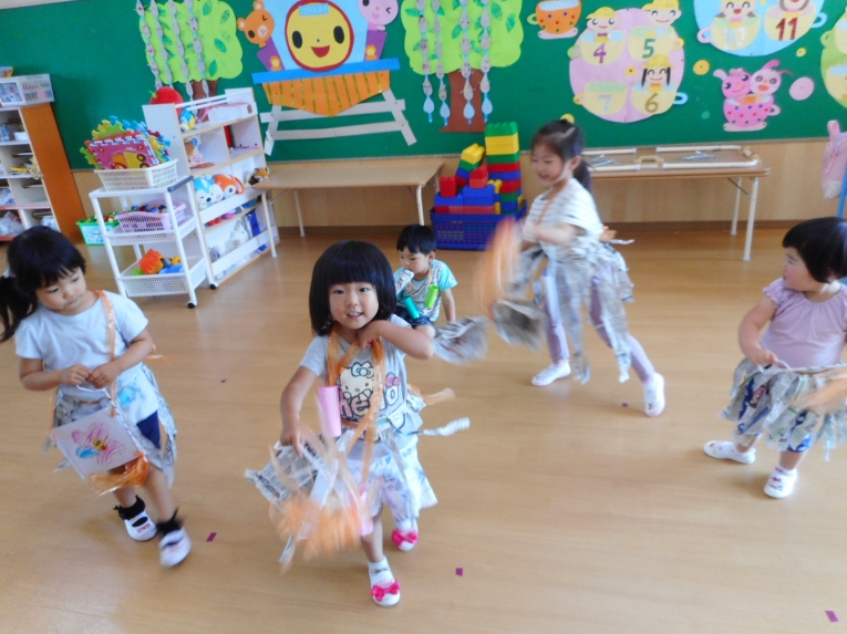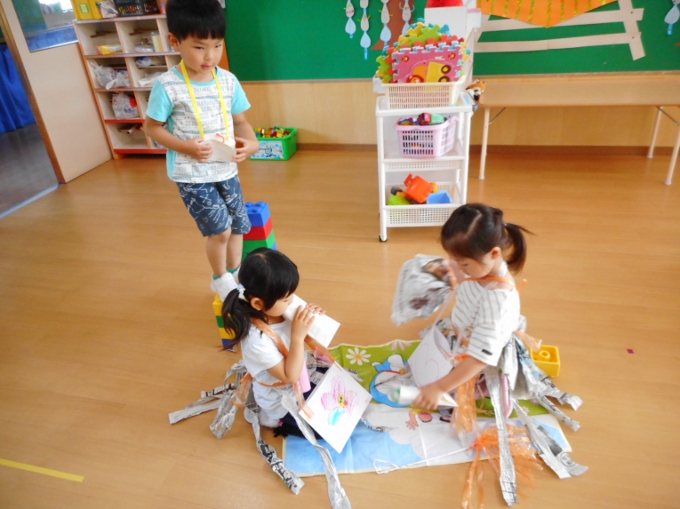 皆で遊んだ新聞遊びの後に、しばらく遊びの中でも新聞で衣装を作ったりしながら、身につけ楽しみました