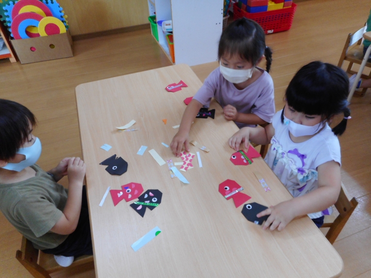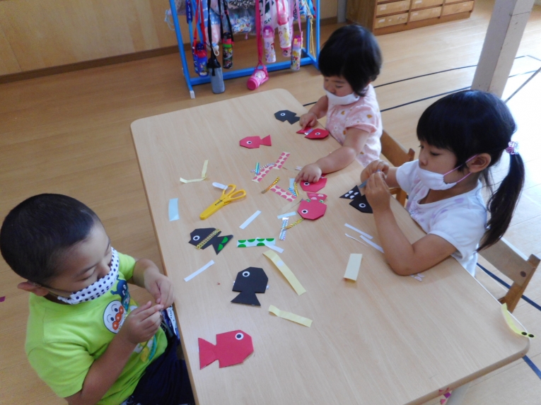 金魚づくりでは・・・二つに画用紙を折って、くっつけて、しっぽの方を切り、目やウロコのシールを貼りました