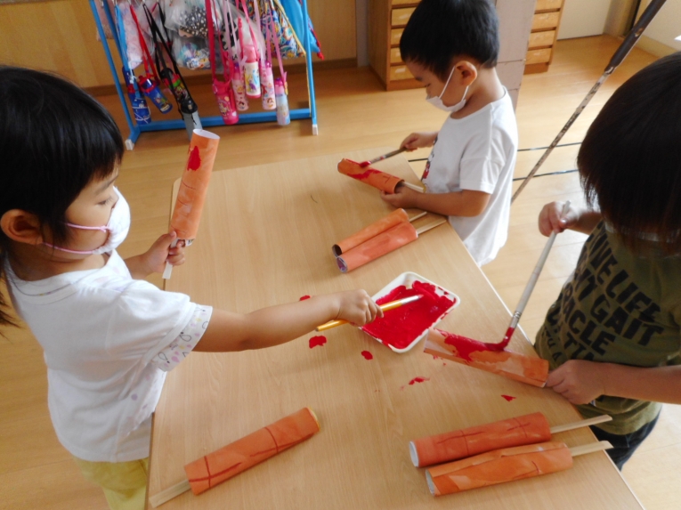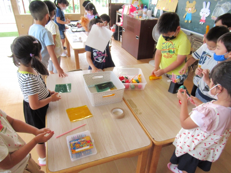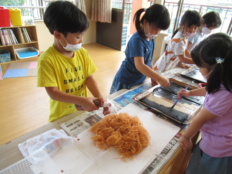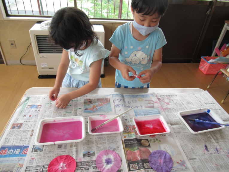 おまつりごっこ「ふじまつり」に向けて、焼きそばの鉄板を染めたり、フルーツ飴をカラーセロファンを使って作ったり、くじ引きの景品を作ったり、くじを作ったり・・みんなで協力して一生懸命準備をしました✨