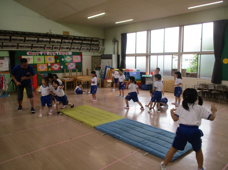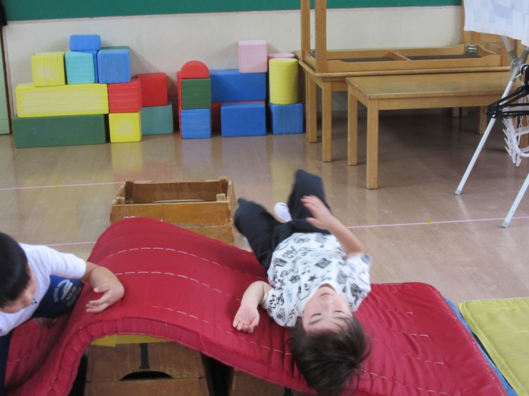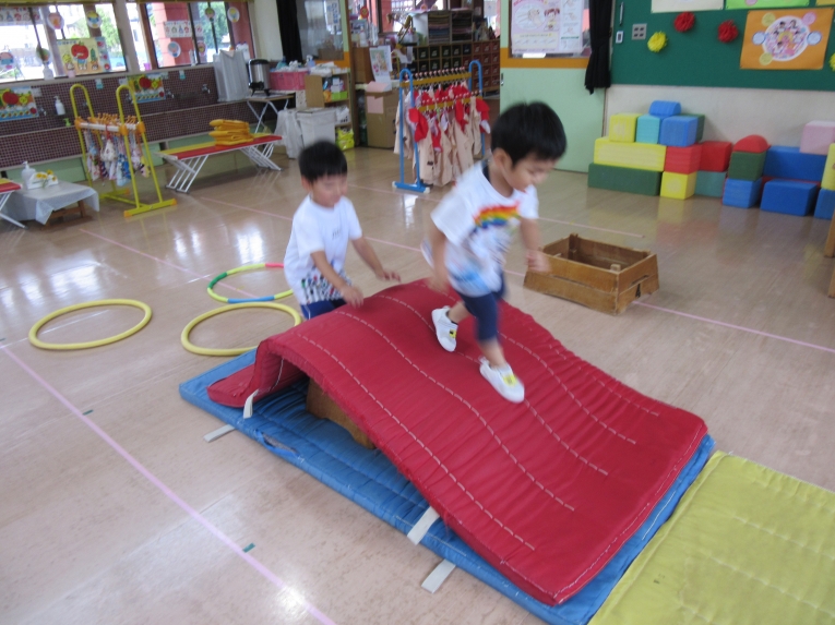 長縄の上を歩いたり、跳び箱からジャンプしたり、マットをゴロゴロしたり、楽しかったね!!
