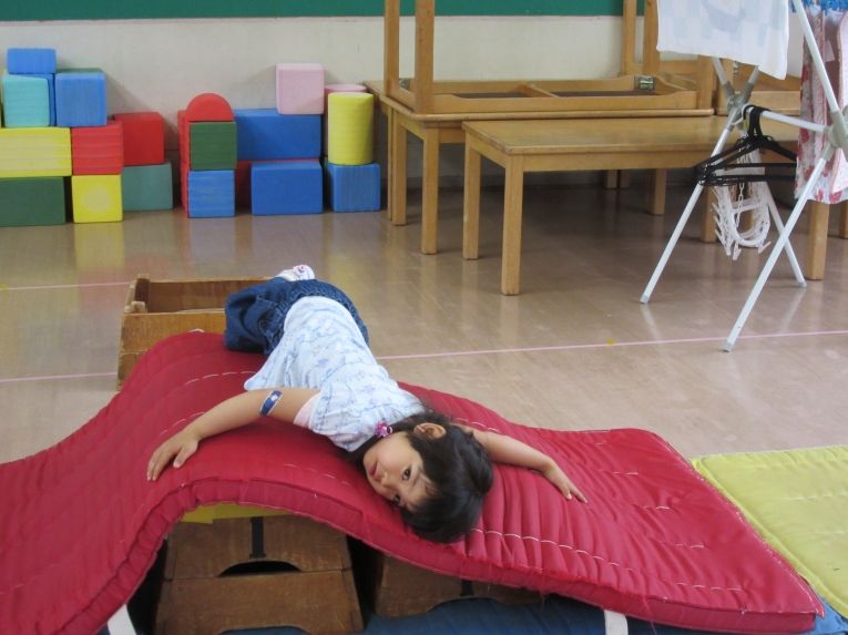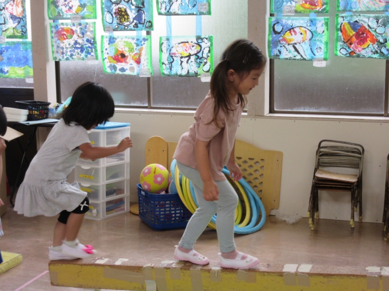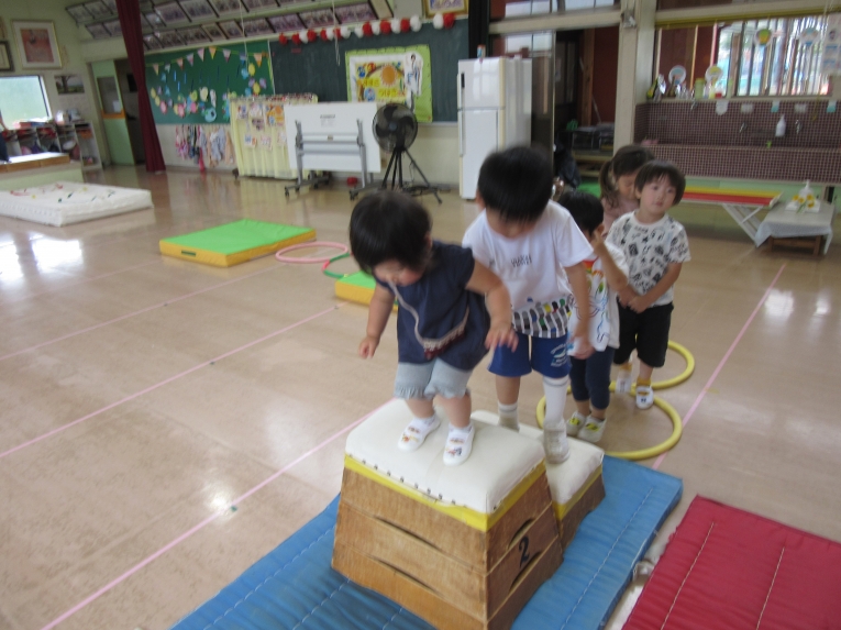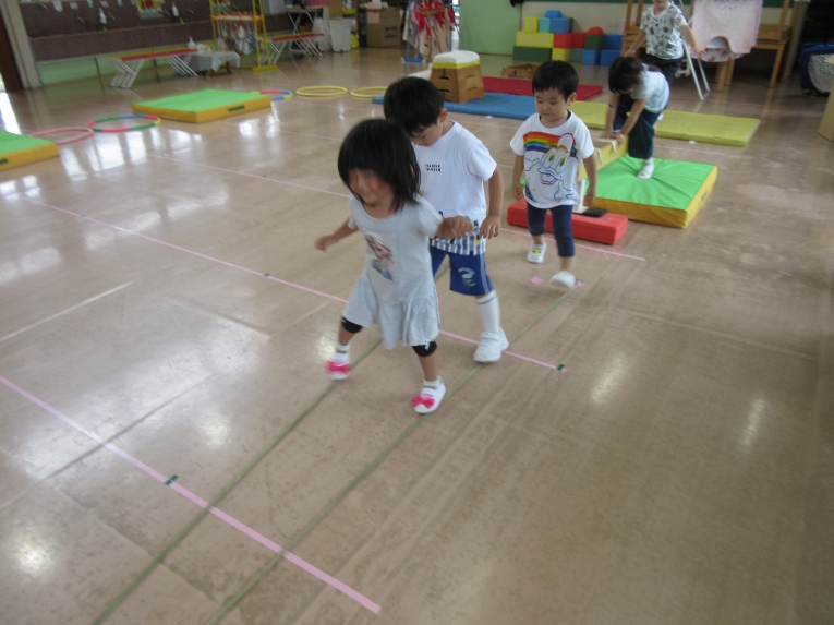 次はワニさん歩き!慣れてきたらコースが長くなって、ジャンプをしたり滑り台を滑ったり、みんな張り切って進みます