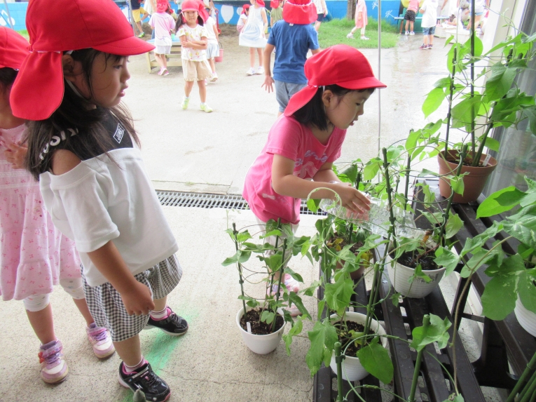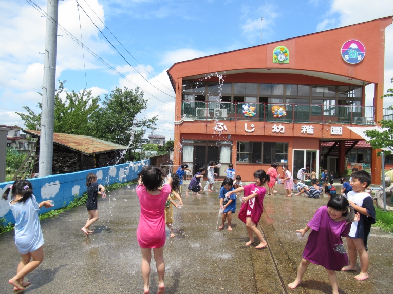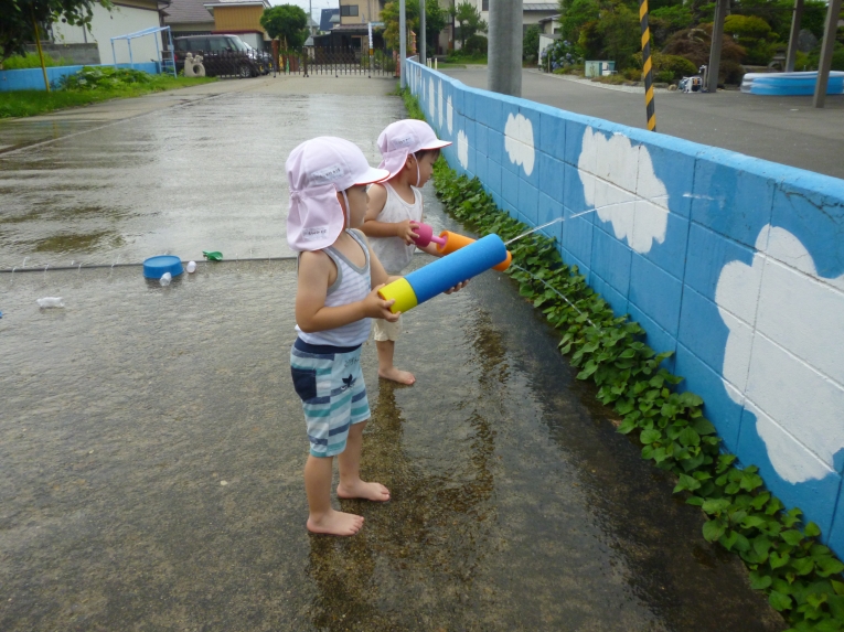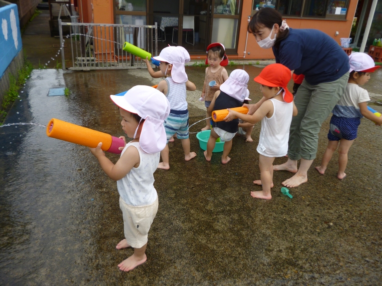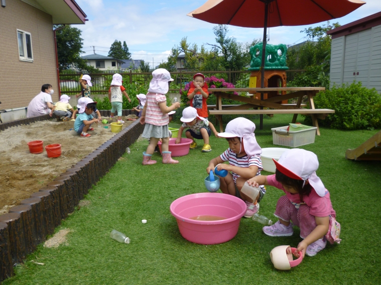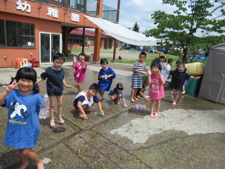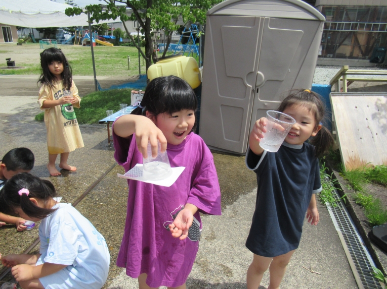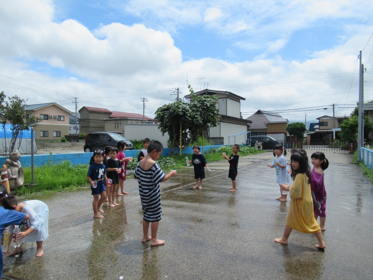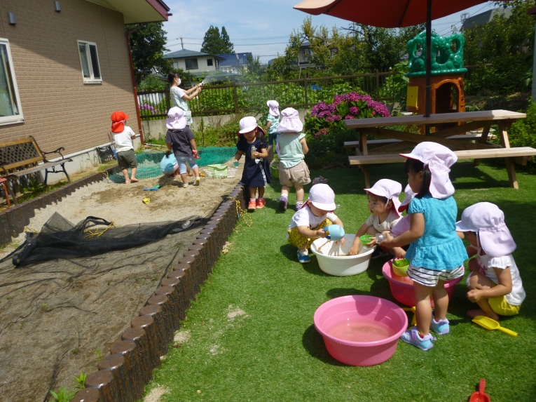 思いきっり水遊びも楽しみました!「みんなあつまって~」と女の子たちの呼びかけに、お水をくんで集合し、「せーの!」でお空に向かってお水をバシャ―天気が良くてきれいでした