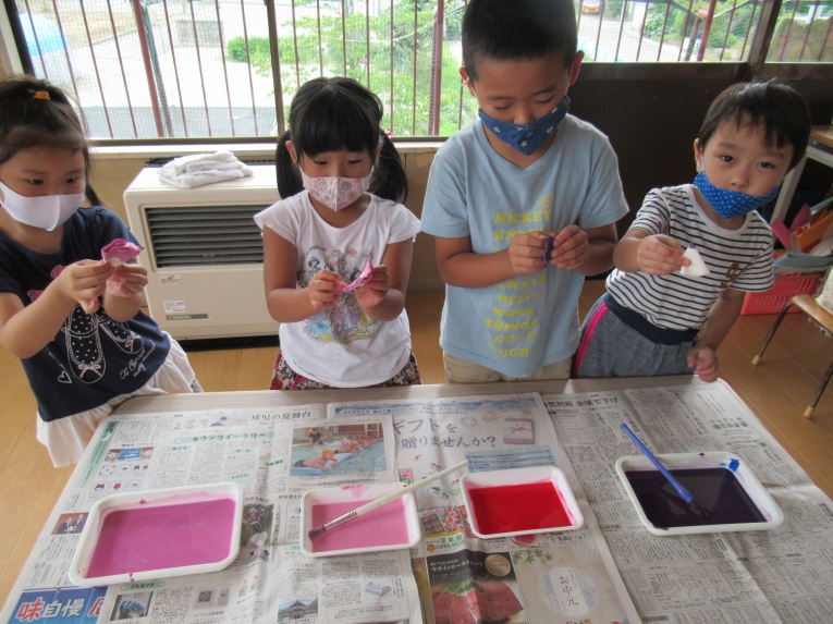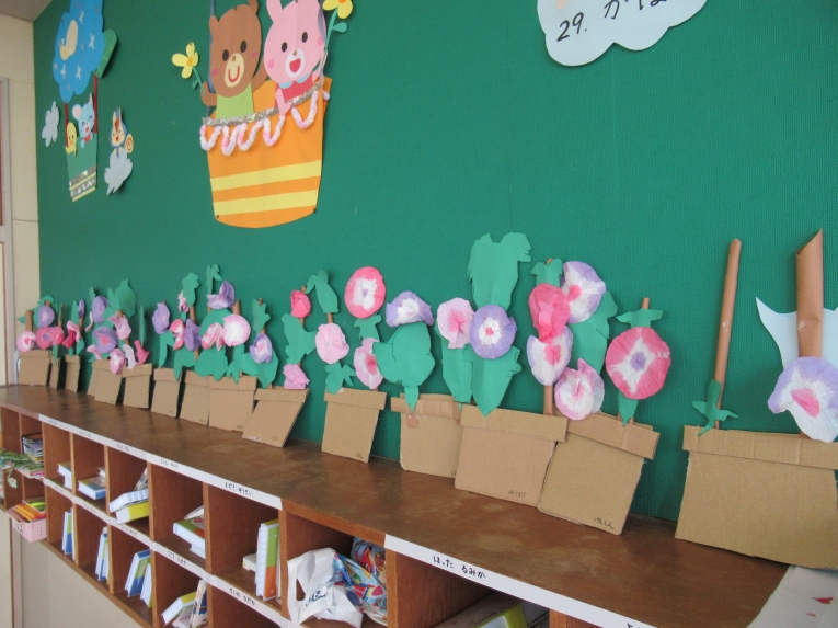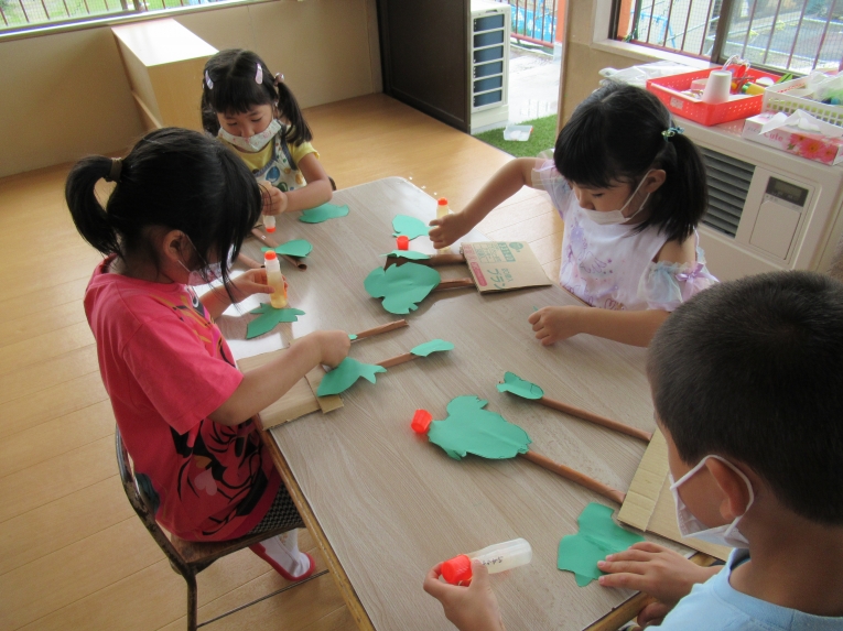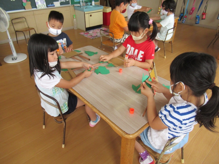 まずは、アサガオ製作✨お水かけをしながら、今日はどうかな?花咲いてる!とよく観察をしていた子どもたちです!葉っぱを自分で描いて切ったり、絵の具をにじませて花の模様をつけたり、植木鉢や支柱にそれぞれ作ったものを張り合わせ完成させました