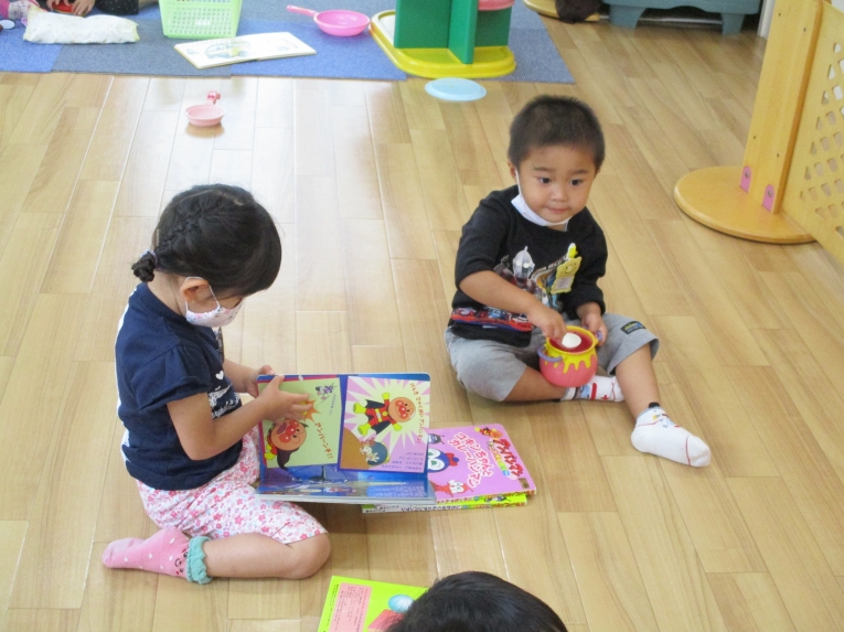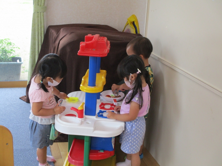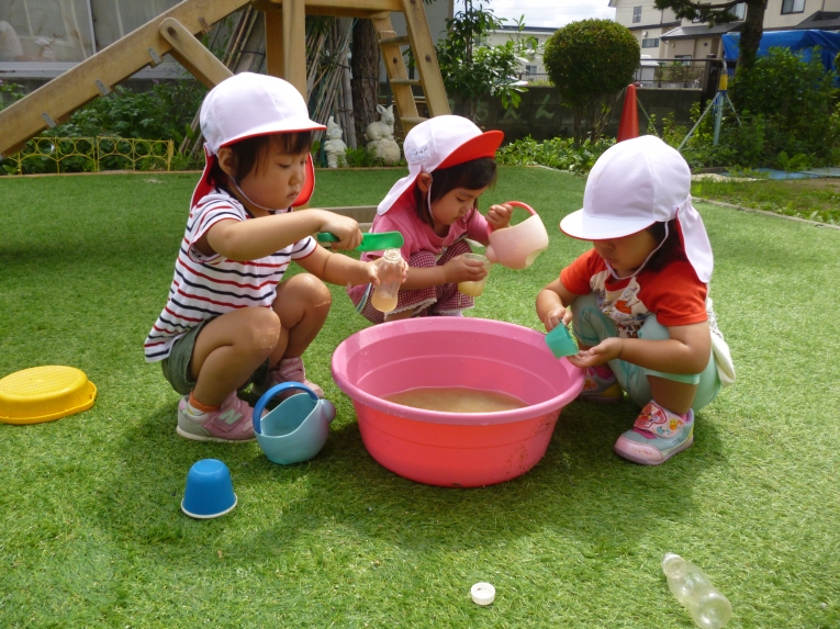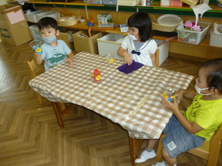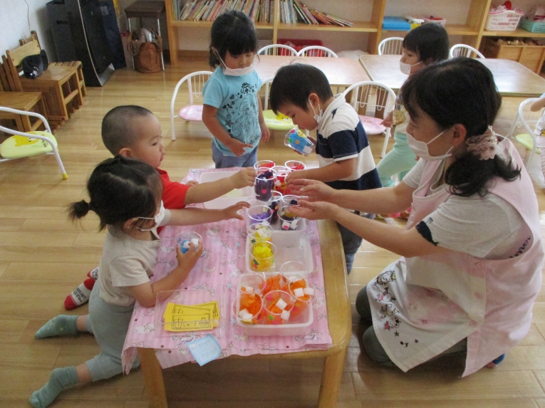 ひよこ組の遊びの中で、おままごと遊びや外での泥水あそびの中で、ジュースやさんごっこをして楽しんで