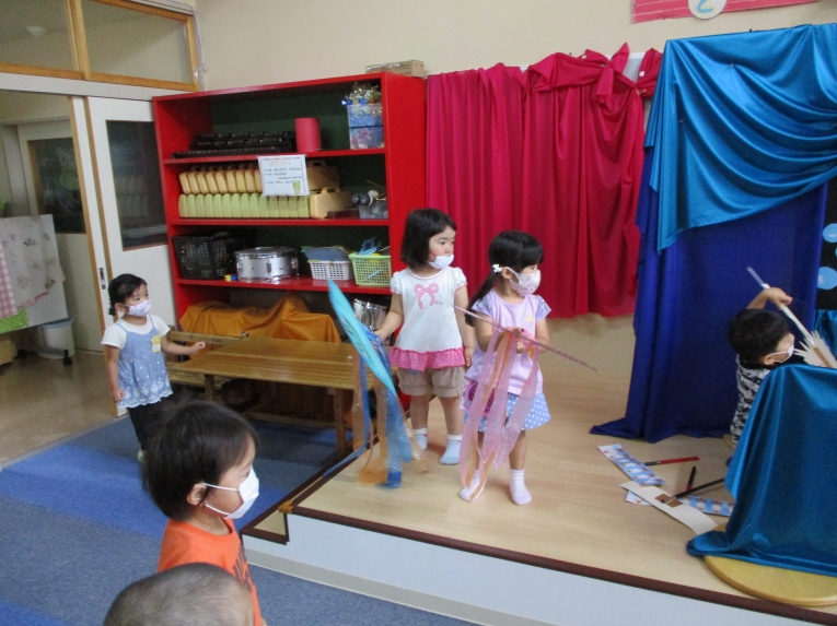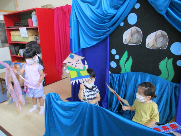 先生たちによるペープサート&パネルシアターの劇場「うみのダンスパーティー」を見た後に、