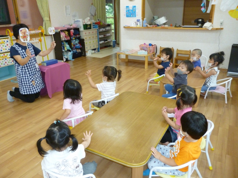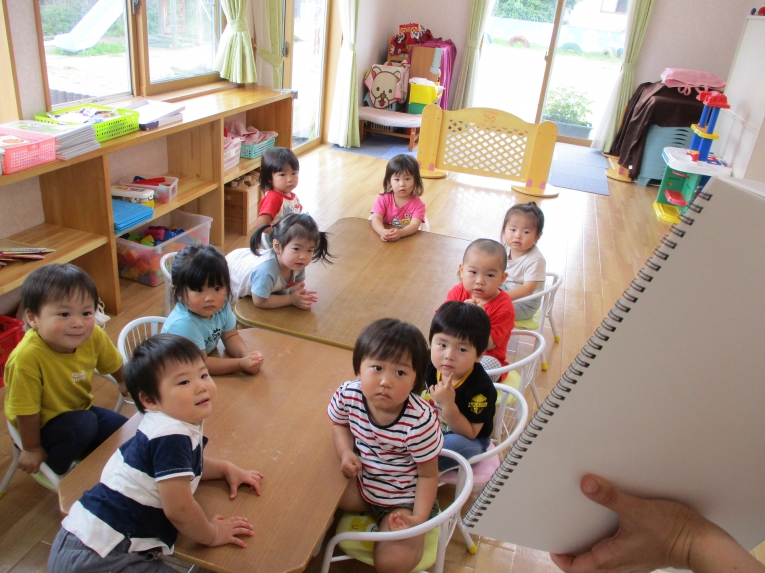 まずは、おまつりごっこってなあに??から始まりましたよ先生からのお祭りペープサートを真剣に見てたひよこちゃんたちでした。