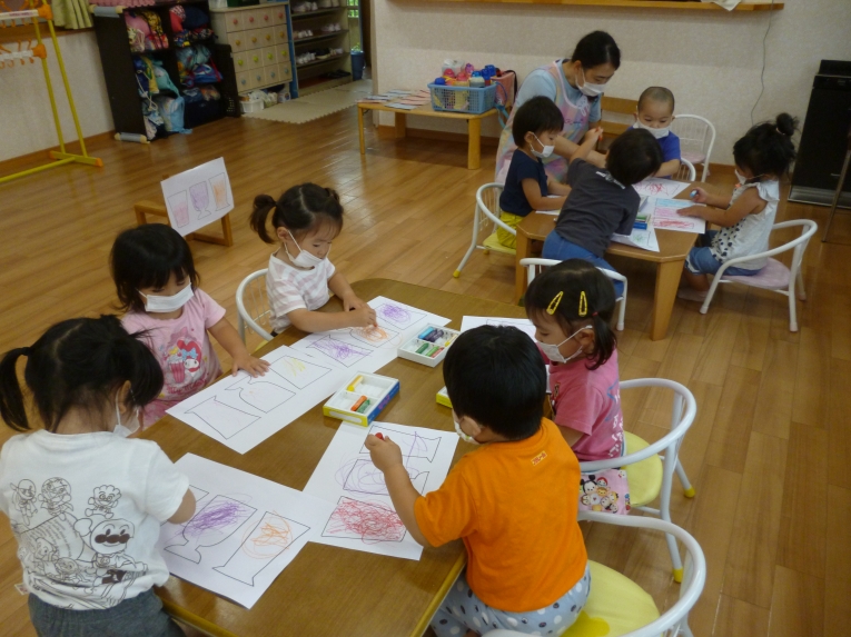はじめは、ジュースのぬりえをしましたよ「しゅわしゅわのジュースがいい!!」「ぶどうジュースが好き」