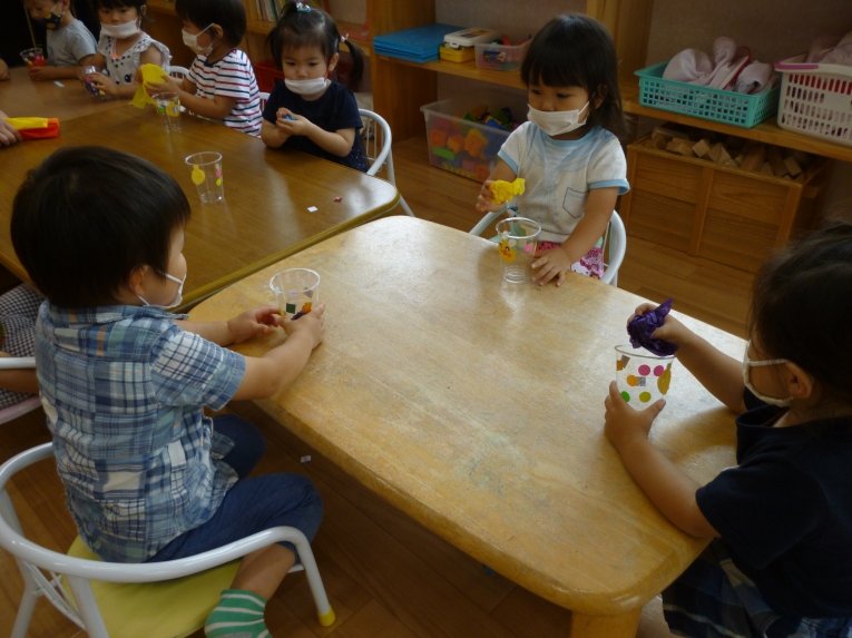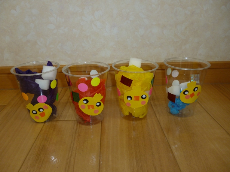 まずは、コップにシールを貼り、かわいいひよこマークもペタッと貼りましたその後、お花紙をくしゅっと入れて